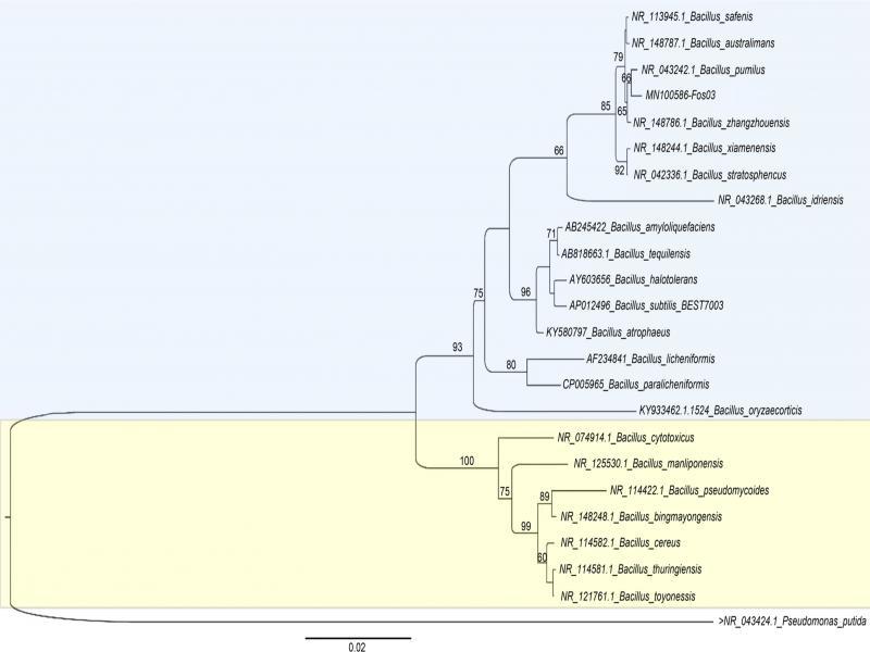 The strain identification based on the 16S rRNA gene sequence. The 16S rDNA sequence was analyzed using the BLASTn algorithm and showed that bacterial strain A3 had 98% similarity with Bacillus pumilus and Bacillus zhangzhouensis. Fig. 3 shows the phylogenetic tree, where bacterial strain A3 appears as Fo03 strain (accession number MN100586), related to B. pumilus and B. zhangzhouensis.