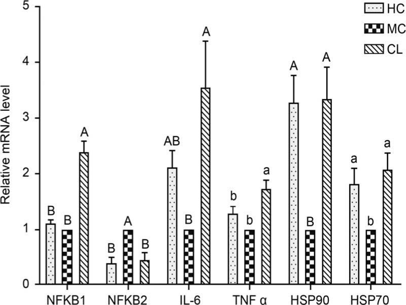 Expression of the genes encoding for heat shock proteins and inflammation-related genes in the liver. Compared to the MC group, the Hsp70 and Hsp90 mRNA expression increased in HC and LC groups (p < 0.05). The NF-κB1 mRNA expression in LC group was upregulated when compared to MC and HC groups (p < 0.05), while higher mRNA expression of IL-6 and TNF-α was observed in the LC group than in the MC group (Fig. 1).