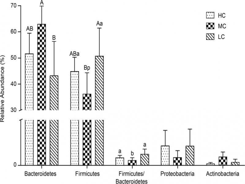 Effects of temperature stress on taxonomic composition. Out of the classifiable sequences, 10 phyla were identified (Fig. S2). Out of the classifiable sequences, ten phyla were identified (Fig. S2). The significant changes of dominant microbiota at the phylum level were determined between the HC, MC, and LC groups (Fig. 2). In the MC group, Bacteroidetes (60.70%) and Firmicutes (36.22%) were the dominant phyla, followed by Actinobacteria (1.00%), Proteobacteria (0.93%), and Tenericutes (0.23%). In comparison, the HC group displayed a 9.02% decrease in the relative abundance of Bacteroidetes (p>0.05), an 8.67% increase of Firmicutes (p< 0.05). The LC group also exhibited considerable phylum-level changes: 17.43% reduction in the relative abundance of Bacteroidetes (p< 0.01), 14.56% increase of Firmicutes (p< 0.01), and 1.65% increase of Proteobacteria (p> 0.05). Meanwhile, the ratio of Firmicutes/Bacteroidetes in LC group increased by 23.31% and 43.98% compared to the HC and MC (p< 0.05) groups, respectively.