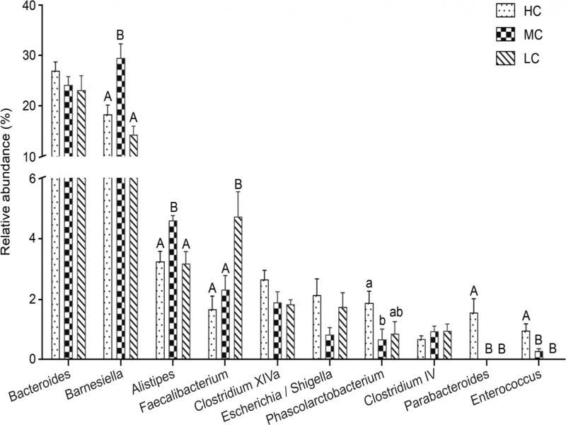 At the genus level, the most abundant phylotypes were Barnesiella, Bacteroides, Alistipes, Faecalibacterium, and Clostridium XlVa, which accounted for 29.48%, 24.19%, 4.59%, 2.33%, and 1.92% of the cecal microbiota of the MC group, respectively (Fig. S3). The remarkable alteration of dominant microbiota at the genus level was noticed between the the HC, MC, and LC groups (Fig. 3). In comparison to MC group, HC group manifested the decrease of 11.12% in the relative abundance of Barnesiella (p< 0.01), and Alistipes (1.34%, p< 0.01), as well as increase of Escherichia/Shigella by 1.28% (p<0.05), Phascolarctobacterium (1.21%, p< 0.05), Parabacteroides (1.58%, p< 0.001), and Enterococcus (0.67%, p< 0.01). The LC group also exhibited considerable changes, including a 15.11% decrease in the relative abundance of Barnesiella (p< 0.001), a 2.38% increase in that of Faecalibacterium (p<0.01), and a 1.39% decrease in that of Alistipes (p< 0.01), respectively.