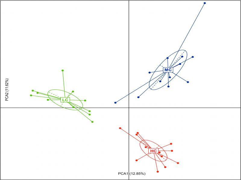High-throughput 16S rDNA sequencing. HiSeq sequencing of the 16S rRNA gene amplicons generated 2,100,180 clean reads (mean length of 414 bp), yielding an average of 58,338 clean reads (52,667–64,809) per sample. Then we rarefied the library size to 32,296 tags per sample using the rarefy function to minimize the impact of the sequencing depth on microbial composition (Table SIII). With a 97% sequence similarity as a cutoff, we obtained 460, 537, and 547 OTUs from the HC, MC, and LC groups, in which the proportion of the core microbiome was 79%, 68%, and 67%, respectively (Fig. S1). Alpha diversity demonstrated different temperature treatments changes in terms of richness and evenness, as summarized in Table II. The Chao1 index in the MC group was significantly higher than that in the LC group (p < 0.05).
