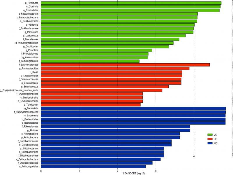 LEfSe identified the most differentially abundant microbiota between HC, MC, and LC groups.