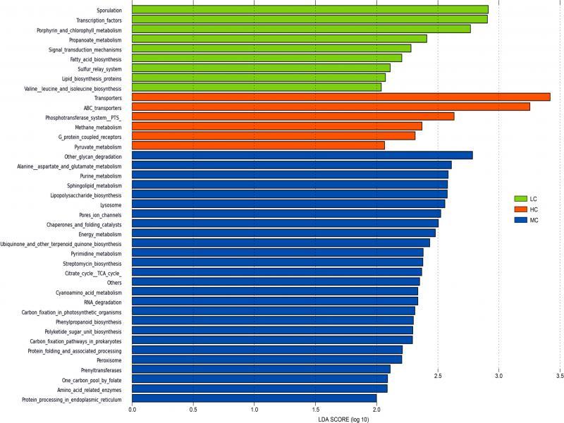 The effects of temperature stress on the microbial functions of caecal microbiota. We observed a striking difference in the KEGG Orthologs (KO) composition of the caecal microbiota. There were 328 differentially enriched KEGG pathways at the L3 hierarchy between the three groups, among which 41 pathways had LDA > 2 (Fig. 6). The pathways enriched in the LC group were related to cellular processes and signaling (e.g. sporulation, signal transduction mechanisms), metabolism (e.g., porphyrin and chlorophyll metabolism, propanoate metabolism, valine, leucine, and isoleucine biosynthesis, fatty acid biosynthesis, and lipid biosynthesis), and gene regulation (e.g., sulfur relay system, transcription factors). The pathways enriched in the HC group were related to environmental information processing (e.g., ABC transporters, G protein-coupled receptors, phosphotransferase system, and transporters) and metabolism (e.g. methane metabolism, and pyruvate metabolism). The pathways enriched in the MC group were related to metabolism (e.g. other glycan degradation, alanine, aspartate, and glutamate metabolism, purine metabolism, sphingolipid metabolism, lipopolysaccharide biosynthesis, ubiquinone and other terpenoid-quinone biosynthesis, pyrimidine metabolism, streptomycin biosynthesis, citrate acid cycle, cyanoamino acid metabolism, carbon fixation in photosynthetic organisms, phenylpropanoid biosynthesis, polyketide sugar unit biosynthesis, carbon fixation pathways in prokaryotes, prenyltransferases, one carbon pool by folate, and amino acid related enzymes), cellular processes (e.g. lysosome, peroxisome), and gene regulation (e.g. chaperones and folding catalysts, RNA degradation, and protein processing in the endoplasmic reticulum).