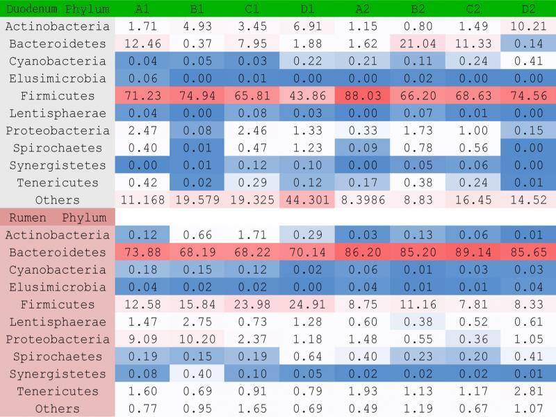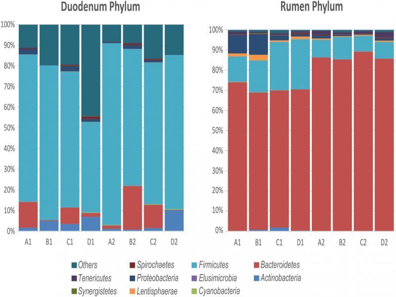 The phylum composition of rumen and duodenum of twin lambs. The letters A1-D1 represent the HFLP group, and the A2-D2 represent the LFHP group of phylum and duodenum, respectively.