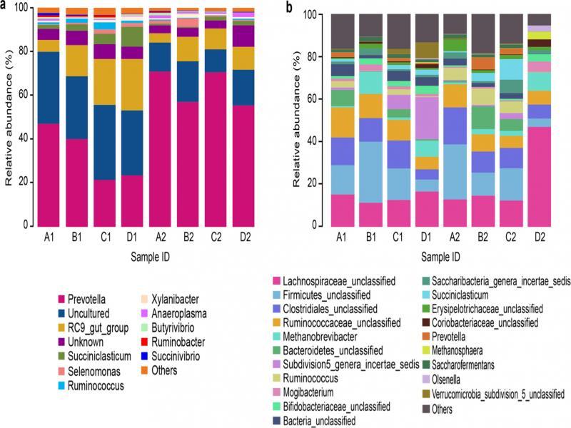a) The genus community distribution of rumen. The letters A1-D1 represent the first group fed with HFLP and A2-D2 represents the second group of twin lambs fed with LFHP in the genus. b) The genus community distribution of duodenum. The letters A1-D1 represent the first group fed with HFLP and A2-D2 represents the second group of twin lambs fed with LFHP in the genus.