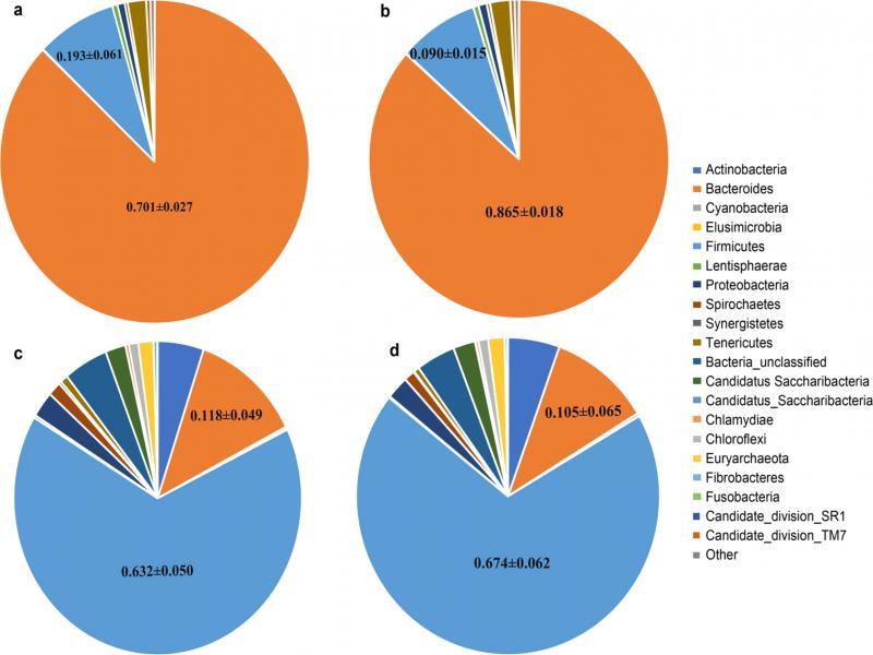 The letters a) and b) represent HFLP pellets and LFHP pellets, respectively, of the rumen. Enterotypes were strongly associated with feeds a) and b) which show LFHP pellets (Bacteroidetes) against HFLP pellets (Firmicutes). LFHP pellets displayed a substantial increase in Bacteroidetes and a reduction in Firmicutes. The letters c) and d) represent HFLP and LFHP pellets, respectively, of the duodenum. Enterotypes were strongly associated with feeds c) and d) which show LFHP pellets (Bacteroidetes) against HFLP pellets (Firmicutes). HFLP pellets displayed an increase in Firmicutes and a reduction in Bacteroidetes.