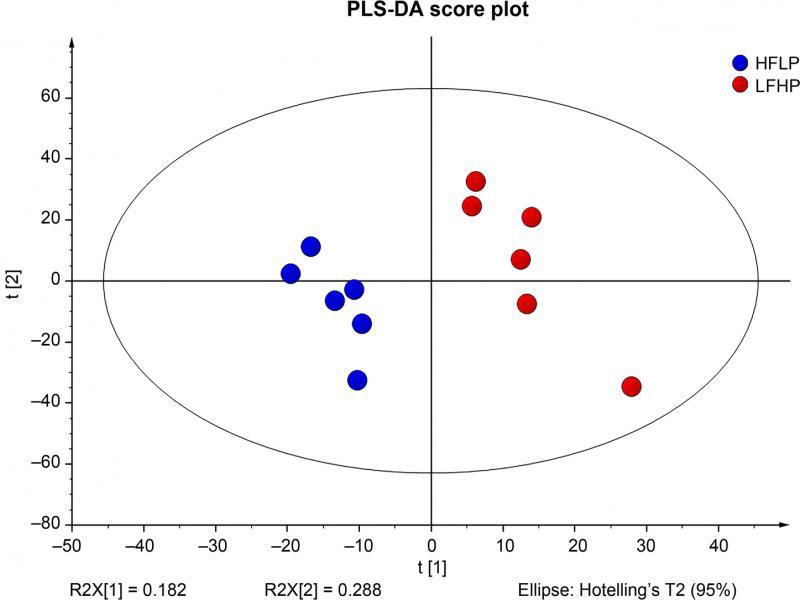 PLS-DA score plot came from liquid chromatography combined with mass spectrometry (LC/MS) spectra for the HFLP group (blue dots) and the LFHP group (red dots).