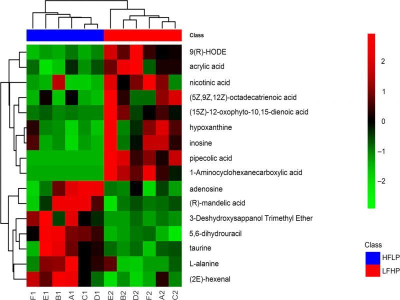 Heat map built by the 407 significantly different metabolites (p-value ≤ 0.05) in the HFLP and LFHP groups. The red color represents the LFHP group, and the blue represents the HFLP group.