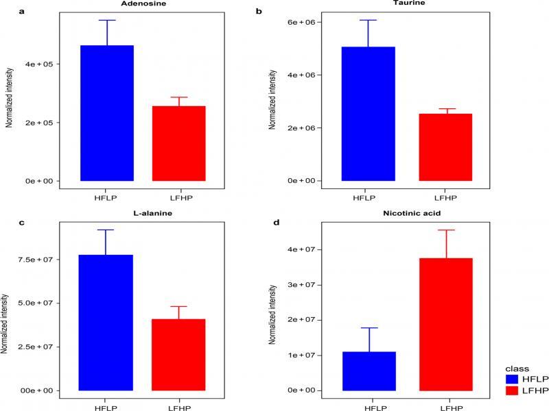 Differential expression metabolites between two groups. After the data was filtered, 3,696 stable metabolic features were detected. A partial least squares discriminant analysis (PLS-DA) was performed between the two groups to identify metabolic differences in duodenum of twin sheep fed different diets (Fig. 5). The results showed that 407 significantly different metabolites (p-value ≤0.05) were screened between the two groups. In the HFLP group, 273 of the metabolites showed a lower expression, and 134 of the metabolites showed a higher expression. Tandem mass spectrometry (MS/MS) was used to detect 16 significantly different metabolites indicated in the heat map (Fig. 6). The HFLP group increased 7 of the metabolites while that of the LFHP group influenced 9 of the metabolites. Some of the metabolites discussed are adenosine, taurine, L-alanine, and nicotinic acid (Fig. 7). It was detected that there was a significant difference between the HFLP diet and the LFHP diet (p-value ≤ 0.05).