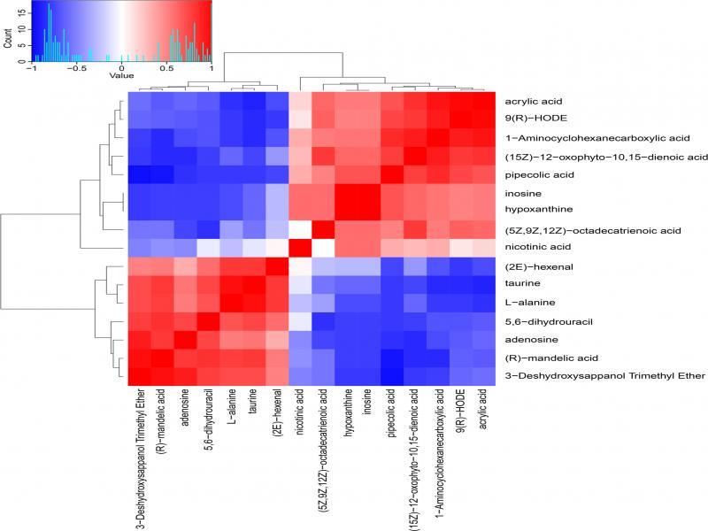 Metabolites correlation heat map. The rows and columns in the figure represent different metabolites, and different colors represent different correlations. The red color represents a positive correlation, and the blue represents a negative correlation among the metabolites. The deeper the color in the heat map, the better the metabolism.