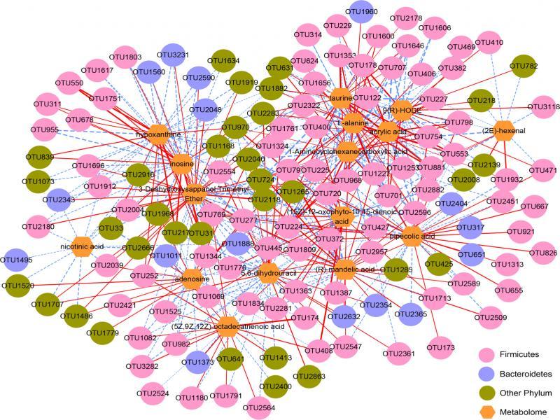 This figure shows the relationship between OTUs, metabolites, and the microbiota. The nodes represent different OTUs related to bacteria, which belong to Firmicutes, Bacteriodetes, and other phyla. The orange diamonds indicate 16 metabolites detected. The lines indicate the correlations between the OTUs, bacteria, and metabolites. The solid red connecting lines show a positive correlation, and the blue connecting dot line indicates a negative correlation between the OTUs, bacteria, and metabolites. The line thickness shows how strong the correlation was.
