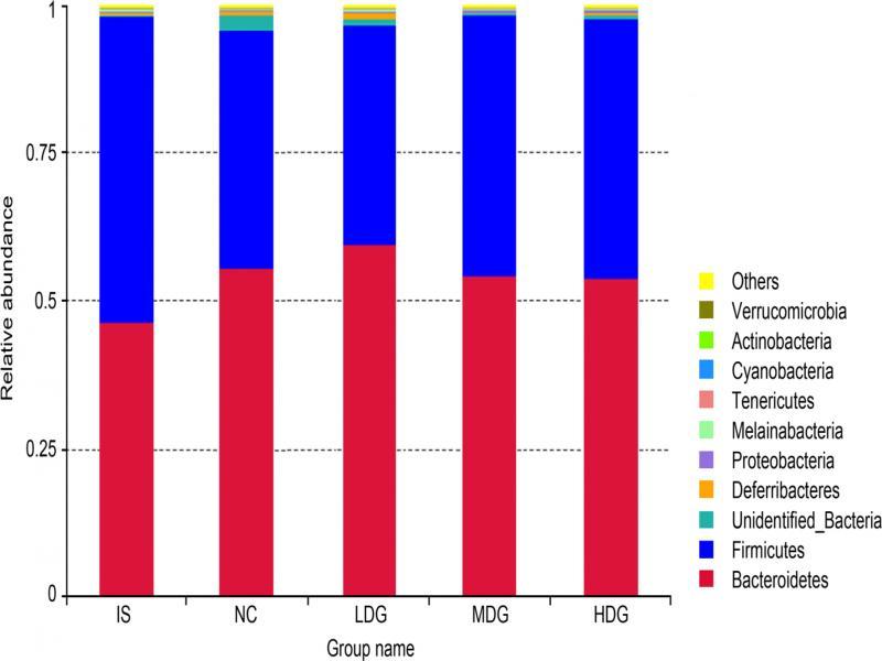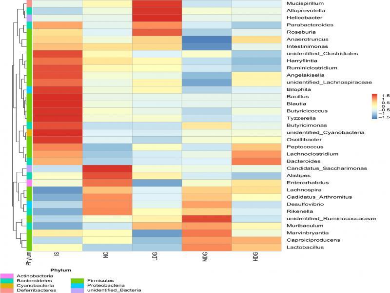 Clustering analysis of species abundance. The heat map showed the relative abundance of the main identified bacteria at the genus level. As shown in Fig. 5, the clustering of gut microbiota was different in the groups. In the initial state, gut microbiota was mainly clustered in Firmicutes. In the NC group, Bacteroidetes were concentrated in the genus of Desulfovibrio. Both Parabacteroides and Alloprevotella from Bacteroidetes dominated the LDG group. In the MDG group, there were large quantities of Ruminococcaceae and Lachnospira in Firmicutes. In the HDG group, Bacteroidetes were concentrated in the genus of Bacteroides.