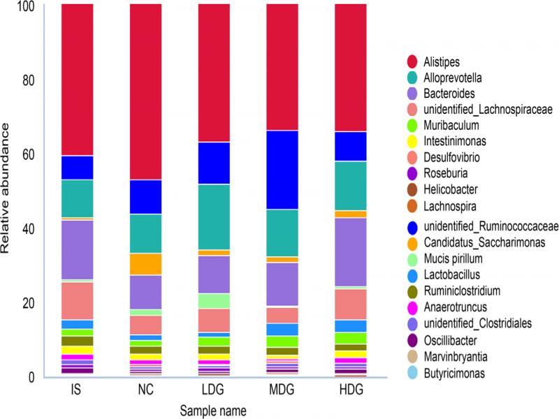 The four most prevalent bacterial genera in the guts of the NC and treatment groups were Alistipes, Alloprevotella, unidentified_Ruminococcaceae, and Bacteroides (Fig. 4). Compared to the NC group, Alistipes exhibited significantly decreased proportions in the HDG group (p = 0.038). In addition, the abundance of Candidatus_Saccharimonas decreased significantly in the MDG and HDG groups (p=0.01, p=0.007). By contrast, Alloprevotella, unidentified_Ruminococcaceae, and Bacteroides showed an upward trend. The abundance of Alloprevotella in the LDG group was significantly higher than that in the NC group (p=0.001). Moreover, compared with the NC group, the abundance of unidentified_Ruminococcaceae in the MDG group increased significantly (p = 0.014), while the abundance of Lactobacillus increased slightly, but there was no significant difference. In addition, the proportion of Bacteroides increased significantly in the HDG group compared to the NC group (p = 0.038).