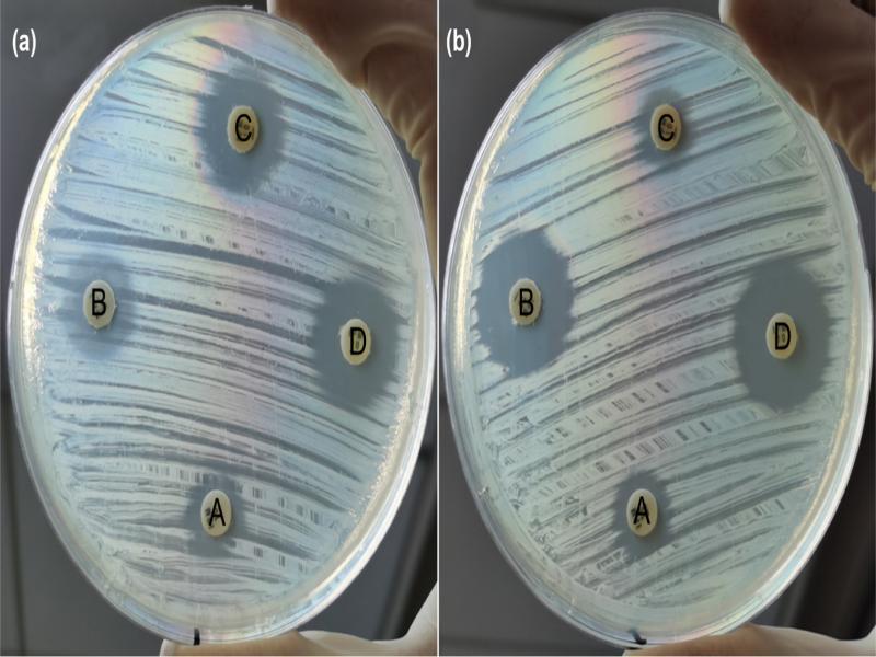 Examples of mCDT showing the inhibitory zone diameters of A, B, C, and D for a) a plate 7, 7, 14, and 15 mm confirming the KPC-producing isolate, and for b) a plate 9, 17, 8, 18 mm confirming the MBL-producing isolate.