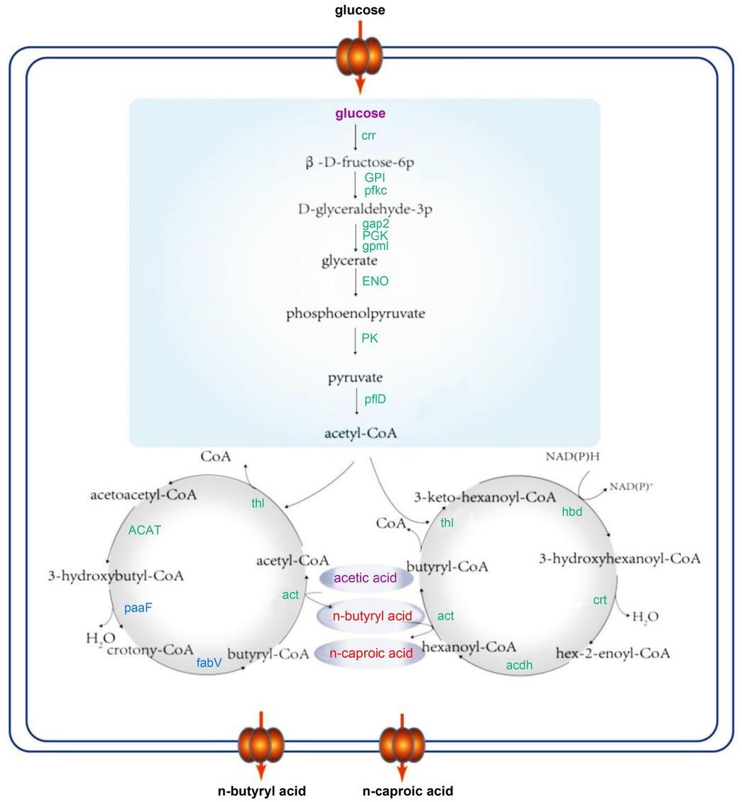 Caproic acid production pathway of strain BF-1. Substrates are shown in purple, products are shown in red, annotated genes are shown in green, and non-annotated genes are shown in blue.