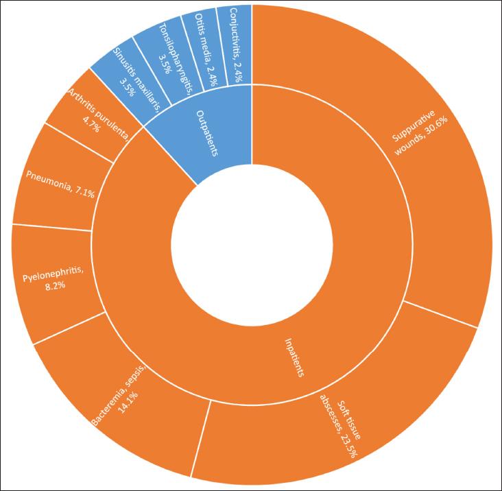 A total of 85 non-duplicate S. aureus isolates obtained from both inpatients (n = 75) and outpatients (n = 10) aged 1–89 were studied. Only outpatients and inpatients in University Orthopedics Hospital “Prof. Boycho Boychev” – ORT included children aged 1-17 years. The investigated strains were isolated during the period 2016-2020 from patients with diagnoses with distribution presented in Fig. 1. The first group isolates, named invasive, were from normally sterile places (n = 47; 55.3%) as follows: blood cultures (n = 12; 14.1%), punctures of soft tissue abscesses (n = 20; 23.5%), bronchoalveolar lavage (BAL) (n = 6; 7.1%), sinus punctures (n = 3; 3.5%), middle ear fluid (n = 2; 2.4%), and articular punctures (n=4; 4.7%). The non-invasive ones (n = 38; 44.7%) were recovered from the skin and mucosal membranes such as nasopharyngeal secretions (n = 3; 3.5%), ocular secretions (n = 2; 2.4%), superficial wounds / suppurative skin lesions (n = 26; 30.6%), and urine (n = 7; 8.2%). Only sinus punctures, ear fluid, and nasopharyngeal and ocular secretions were obtained from outpatients (with CA infections). The inpatients were treated in three university hospitals in Sofia, namely: 1) University Hospital “St. Ivan Rilski” (SIR) with its clinics: HD – Hemodialysis, ID – Therapy of Internal diseases, NS – Neurosurgery, PD – Occupational diseases, and RE – Rheumatology; 2) University Orthopedics Hospital “Prof. Boycho Boychev” (ORT); 3) Military Medical Academy (MMA) with the following clinics: AS – Abdominal surgery, CS – Chest surgery, NS – Neurosurgery, SS – Septic surgery, VS – Vascular surgery, DE – Dermatology, and ICU – Intensive Care Unit.