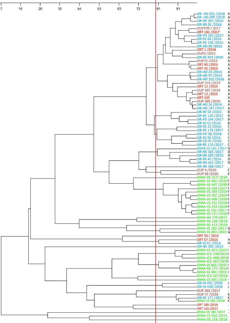 Epidemiological characterization of 85 MSSA strains was performed. Isolates with 80% coincidence in the phylogenetic tree were included in each cluster. Upon analysis of the results, ten major clusters were designated: A, B, C, D, E, F, G, H, I, J, and K (Fig. 2). Of these, cluster A was predominant among the investigated MSSA strains and comprised 27 strains (31.8%). The next most common was cluster F, grouping 11.8% of the tested isolates. In third place was cluster I, with a frequency of 9.4% of the examined strains. The remaining cluster groups contained significantly fewer or single isolates from staphylococcal infections found on an outpatient basis or only in some clinics. Cluster A was dominated by isolates from the University Hospital SIR (14 total), mainly from the HD Clinic – eight isolates (seven from blood cultures and one from puncture). Three isolates from this cluster were found in the RE Clinic, two isolates from patients of the NS Clinic, and one from a patient at the PD Clinic. This cluster included seven more strains isolated from patients operated on in the ORT and six outpatient isolates (Fig. 1). Every MSSA originated from a different type of sample, but most of them were from blood culture (14.1%) with a significant difference (p < 00001) between patients with bacteremia and sepsis (29.6). Over 77% of isolates in this cluster were invasive. They were predominantly isolated from patients undergoing hemodialysis at the SIR-HD or with severe fractures, less frequently after joint prosthetics operated at the ORT, which raises suspicion of a higher virulence of this cluster. The virulence genes in the cluster A isolates were hlg, can, tst-1, sea, seb, sec, sed, seg, sei, sej, she, hlg, seg, sei, and sej with different combinations. They were present in all blood culture isolates. In superficial skin wounds, eye, and nasopharyngeal secretion isolates, the combination of hlg, seb, sec, sei, and sej prevailed.