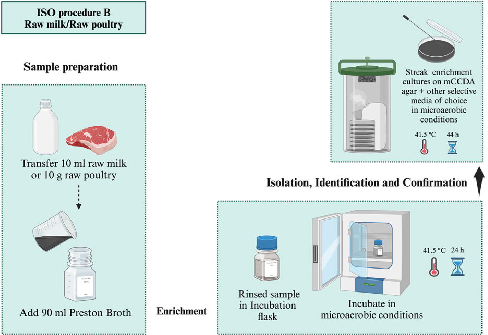 | ISO | Samples with low campylobacters versus high background bacteria | Not required | Preston broth | mCCDA + other media of choice | ISO 2017 |