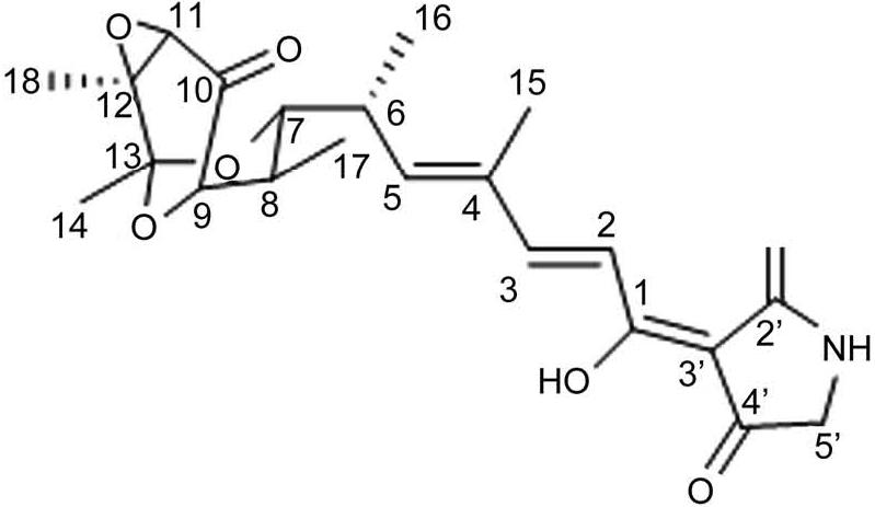 Tirandamycin B and tirandamycin A were first isolated from S. tirandis and Streptomyces flaveolus in the 1970s, the antibiotics belonging to the tetramic acid (2,4-pyrrolidinedione) class, initially identified as inhibitors of bacterial RNA polymerase and HIV protease activity (Dhavan et al. 2016). Tuske et al. (2005) utilized X-ray to analyze the three-dimensional crystal structure of the structurally similar antibiotic rifamycin in complex with RNA polymerase. They elucidated the mode and mechanism of inhibition, which differs from rifampicin’s action on bacterial RNA polymerases. These findings suggest potential for tirandamycin in drug development, serving as a lead compound for molecular manipulation and combinatorial synthesis to create tetramic acid ring structures with enhanced or novel drug activity.
