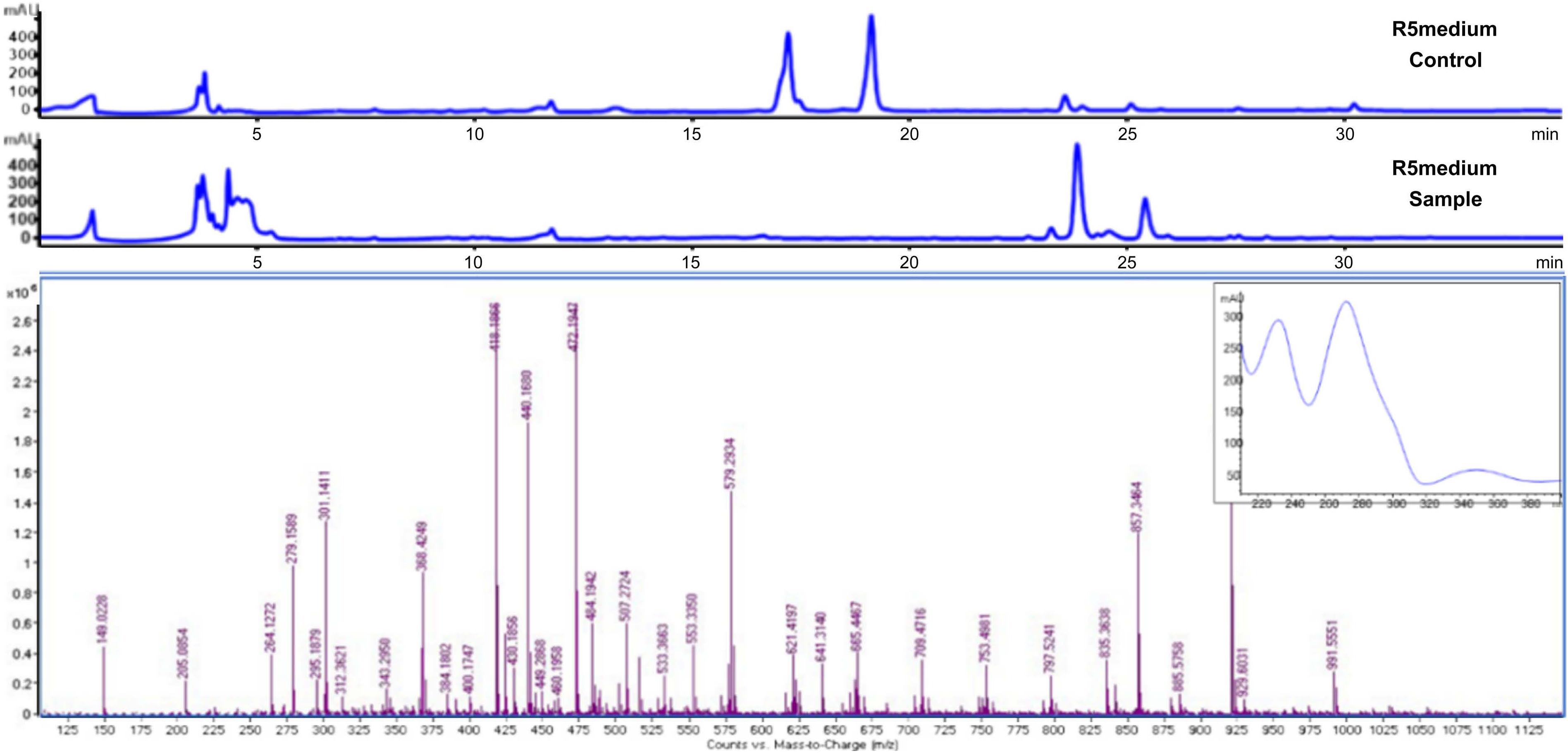 Upon examination of the reference, it was noted that tirandamycin displayed distinct UV absorptions at 213 nm and 351 nm (Rateb et al. 2014), with a theoretical high-resolution mass spectral signal [M + H] + of 418.1792. The identifiable UV absorption and mass spectral peaks of the desired compounds were specifically detected in the 01, 08, 09, and R5 mediums, with the highest concentrations observed in the R5 fermentation medium, and it was determined by mass spectrometry that R5 can produce tandamycin, as shown in Fig. 1 and Fig. S2. Analysis using Q-Tof results revealed a peak with similar UV absorption and mass spectral signal [M + H] + of 418.1866 appearing in the liquid phase around 24 minutes, suggesting a potential identification of tirandamycin A.