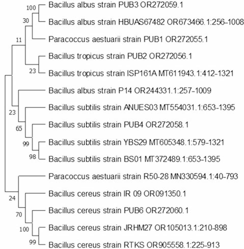 The evolutionary tree constructed for the present study bacteria is shown in (Fig. 1). According to this analysis, P. aestuarii PUB1 and B. albus PUB3 were closely related to B. albus strain HBUAS6748 via bootstrap values of 30 and 100, respectively. B. tropicus PUB2 shared the same clade with B. tropicus strain ISP161A through a bootstrap value of 23. B. subtilis PUB4 showed relatedness with B. subtilis strains YBS29 and BS01 via bootstrap value of 99. B. cereus PUB6 shared the same clade with B. cereus strains JRHM27 and RTKS through strong bootstrap value of 100.