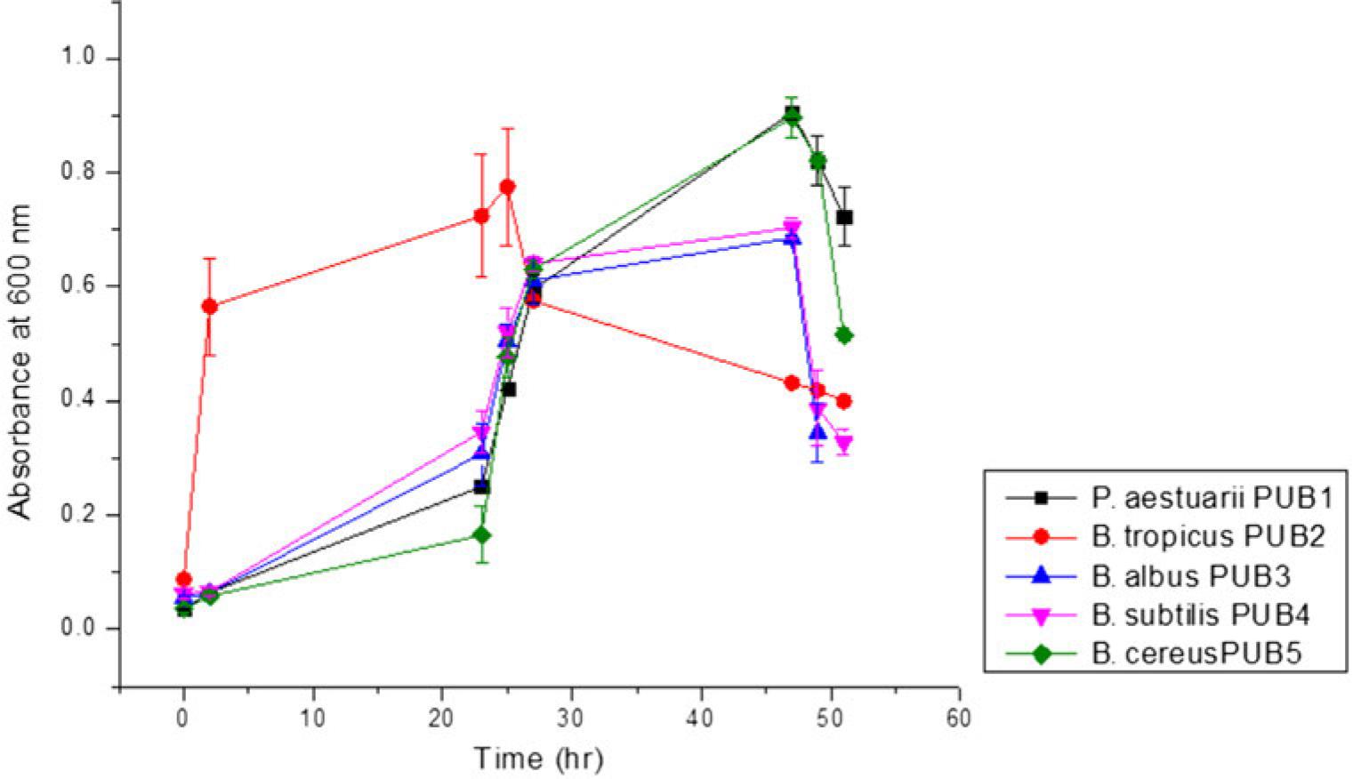 All bacteria were fast-growing, with the log phase starting at 23 h in B. tropicus PUB2 and 25 h in P. aestuarii PUB1, B. albus PUB3, B. subtilis PUB4, and B. cereus PUB6. P. aestuarii PUB1, B. subtilis PUB4 and B. cereus PUB6 exhibited longer exponential phases i.e., 25–47 h. In PUB1, B. subtilis PUB4, and B. cereus PUB6, the stationary phase started at 48 h and lasted for 3 h and 1 h, respectively (Fig. 2).