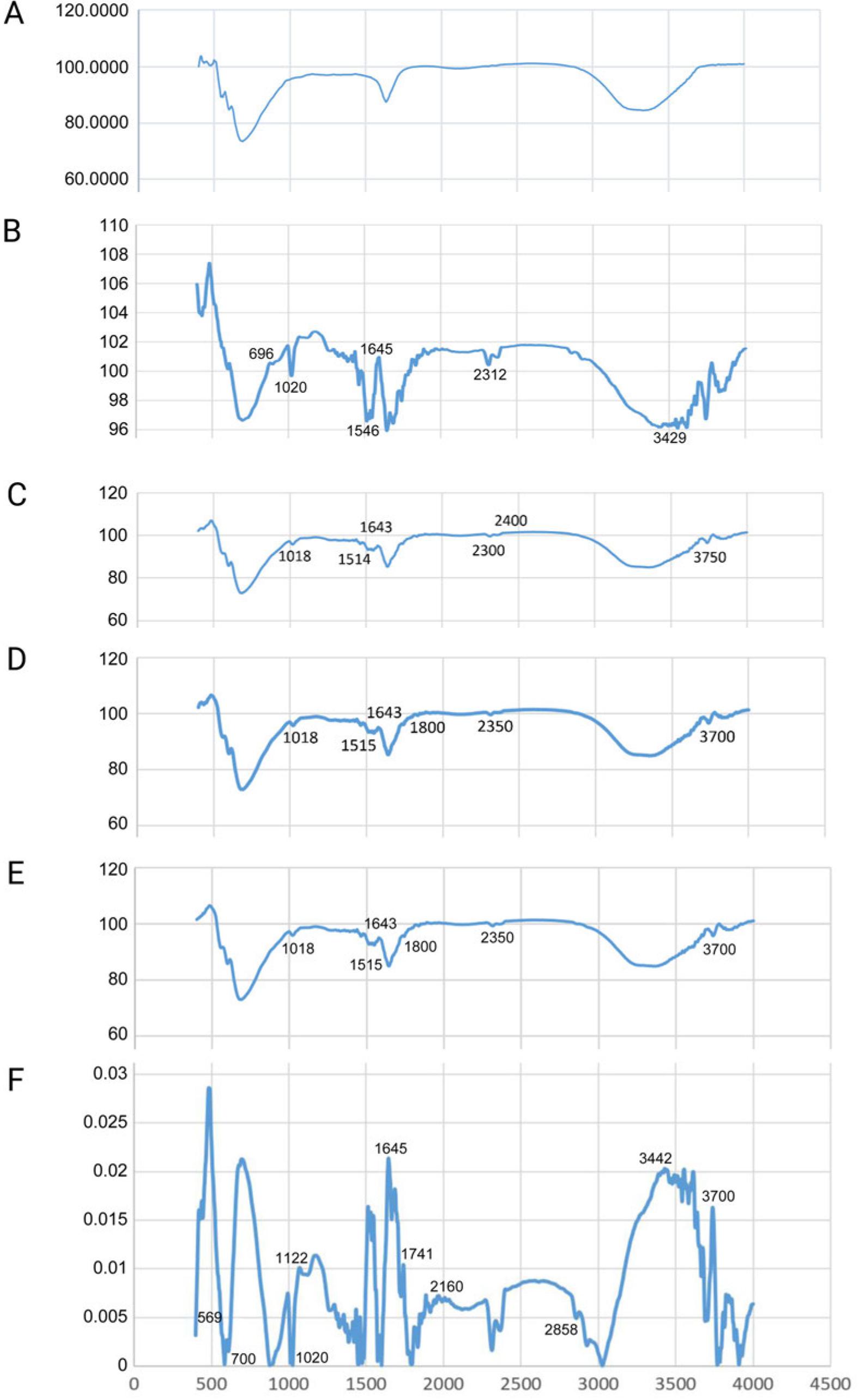 Compared with the control, P. aesturii PUB1 and B. cereus PUB6 FTIR spectra showed significant changes in the peaks throughout the spectra (Table I). While B. tropicus PUB2 and B. albus PUB3 showed shifting of peaks in the regions of 400–750 cm−1, 1000–1900 cm−1, 2200–2500 cm−1 and 3000–3800 cm−1 (Fig. 3). Sharp predominant peaks in FTIR spectra were observed that reflected the metabolites identified through GC-MS spectra i.e., for toluene peaks at 1452 cm−1 (asymmetric stretching frequency of C=C), 2851 cm−1 and 2920 cm−1 (stretching vibrations of = C–H and –C–H), were observed. In case of benzyl alcohol peaks at 3427 cm−1 (O–H stretching), 3010 cm−1 (unsaturated C–H) and 2900 cm−1 (saturated C–H stretching), benzaldehyde peaks at 1637–1733 cm−1 (C=O stretching vibrations), benzoate peaks at 3427 cm−1 (–OH stretching) and 1271 cm−1 (C–O–C bonds stretching), catechol peaks at 3427 cm−1 (OH stretching), 1658 cm−1 (C=C stretch), 1250 and 1281 cm−1 (C–O stretch vibrations), 746 and 850 cm−1 (out of plane bending of = C–H bond of aromatic ring), cis-1,6-dihydroxy 2,4-cyclohexadiene-1-carboxylic acid peak at 2,800–3,300 cm−1 (C-H bond stretching), phenol peaks at 3427 cm−1 (OH bond stretch) and 1650 cm−1 (C=C stretch), cis, cis-muconate peaks at 1540–1650 cm−1 (asymmetric stretching vibrations of CO2−) and 1360–1450 cm−1 (symmetric stretch of CO2−), 3-oxoadipate enol lactone and 3-oxoadipate peaks at 1637–1733 cm−1 (C=O stretch vibrations) and 3427 cm−1 (OH stretching) and palmitate 685 and 723 cm−1 (-OH swinging vibrations), 939 cm−1 (–OH out-plane stretch vibrations) and 1299 cm−1 (–OH in-plane stretching), 2848 cm−1 (–CH2 symmetrical stretching), 2913 cm−1 (–CH3 symmetrical stretch vibrations), 1695 cm−1 C=O stretch vibrations, and 1464 cm−1 (–CH2 and –CH3 deformation vibrations).