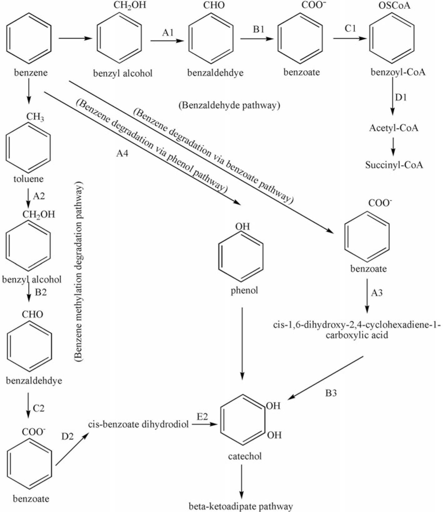 A1 – benzyl alcohol dehydrogenase, B1 – benzaldehyde dehydrogenase, C1 – benzoate CoA-ligase, D1 – benzoyl-CoA 2,3-dioxygenase, A2 – methyl monooxygenase, B2 – benzoyl alcohol dehydrogenase, C2 – benzaldehyde dehydrogenase, D2 – benzoate 1,2-dioxygenase, E2 – dihydrocyclohexadiene carbohydrate dehydrogenase, A3 – benzoate dioxygenase, B3 – benzoate cis-diol dehydrogenase, A4 – benzene phenol monooxygenase