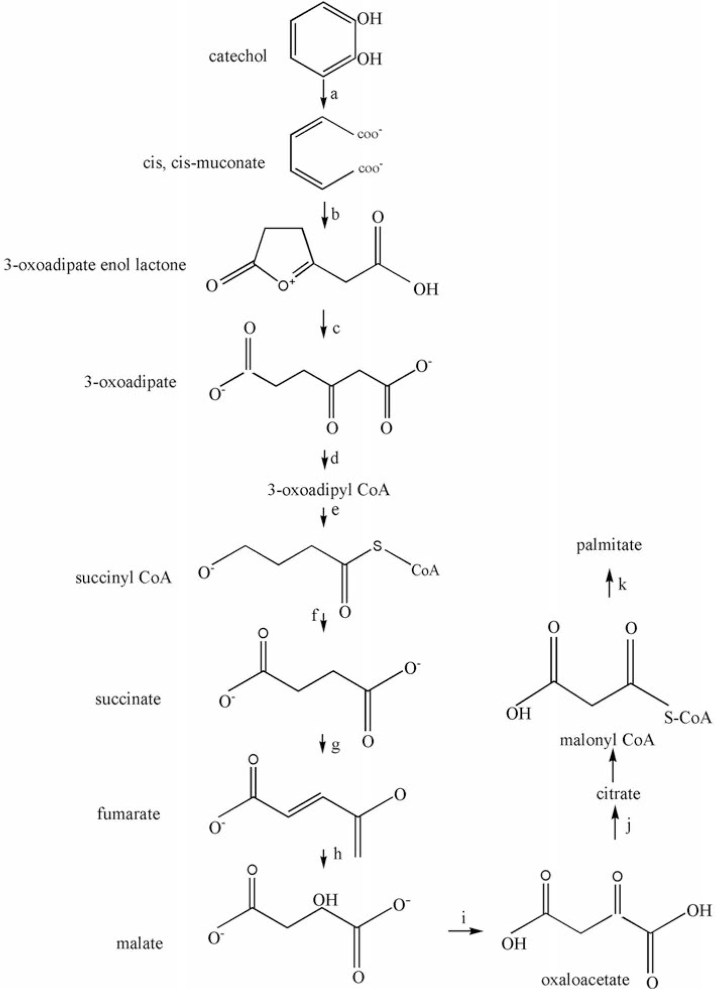 a – catechol 1,2-dioxygenase, b – muconate cycloisomerase, c-d – beta-ketoadipate:succinyl CoA transferase, e – succinyl CoA:acetyl CoA C-succinyl transferase, f – succinyl-CoA synthetase, g – succinic dehydrogenase, h – fumarase, i – malate dehydrogenase, j – citrate synthase, k – fatty acid synthase