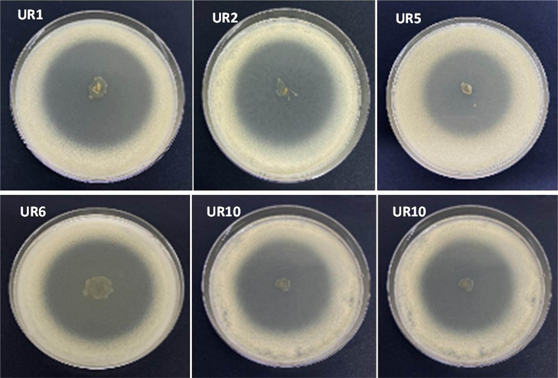 A total of fifty-two uricase-producing bacteria were isolated from the collected samples. Poultry waste samples yielded forty-two uricase-producing isolates, whereas the remaining isolates came from the soil samples (Table I). Clear zone forming isolates were purified and characterized (Fig. 1). All these isolates appeared as Gram-negative motile, and non-sporeforming short rods, and catalase, and oxidase positive. They exhibited uricase activity through clear zone formations around their colonies (Table I, II, and Fig. 1). The most promising of these isolates (UR1, UR2, UR5 UR6, and UR10) were selected for further genotypic and phenotypic characterizations.