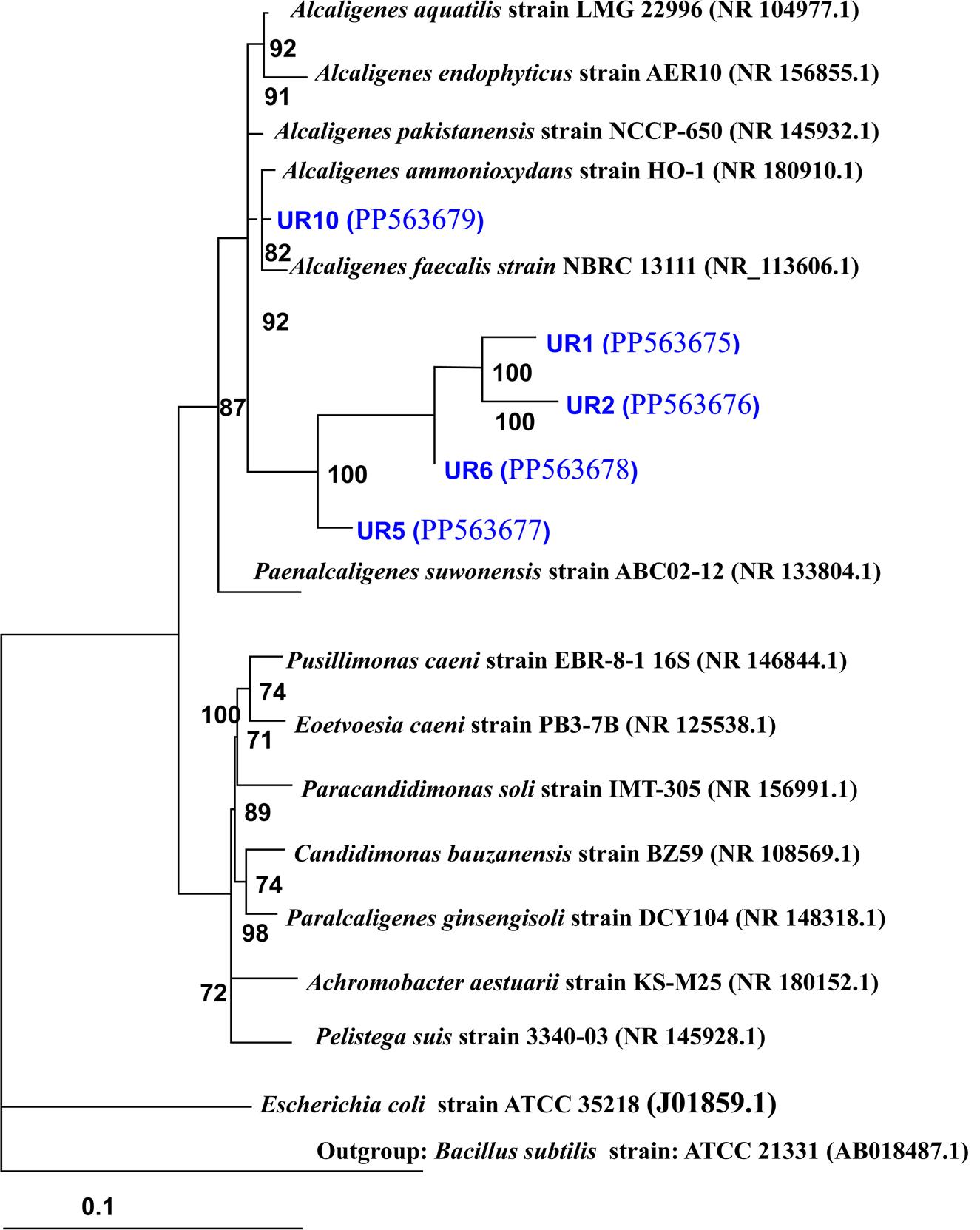 The analysis of 16S rRNA gene sequences indicated a close relationship of strain UR10 with A. faecalis strain NBRC 13111 (NR_113606.1) and A. ammonioxydans strain HO-1 (NR_180910.1) with a similarity of 98.02% and 98.84%, respectively. Other strains (UR1, UR2, UR5, and UR6) clustered together in a new clade and exhibited similarity (96.96, 95.40, 97.28, and 98.77%) to A. ammonioxydans (NR_180910.1) and A. faecalis (NR_113606.1). Alcaligenes spp. is common in water and soil environments, and intestinal tracts of vertebrates (Ray and Pattnaik 2024). Conventional phenotypic bacterial identification is generally not as accurate as genotypic methods.