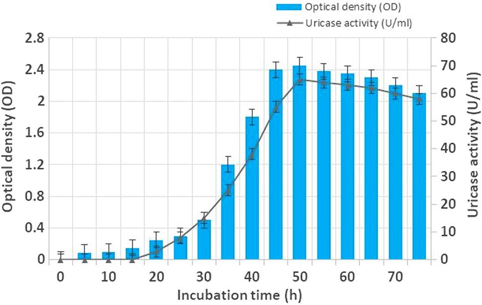 During this study, the growth and uricase secretion of strain UR1 were optimized by evaluating different incubation times (24, 48, 72, and 96 h), temperatures (20, 25, 30, 37, 40, 45, and 50°C), and initial pH (pH 5, 5.5, 6, 6.5, 7, 7.5 8, 8.5, and 9). The results revealed that strain UR1 achieved maximum growth (2.5 OD) and uricase activity (65 U/ml) after 50 h incubation period. Initial growth phases were characterized by a high uric acid consumption rate, leading to reduced uric acid concentration and increased biomass. Ghosh and Sarkar (2014) have also reported 99% uric acid consumption by Comamonas spp. in 33 h at 37°C. Atty and Joseph (2016) reported a higher uric acid consumption rate by Ochrobactrum anthropic strain during initial growth phases, which reduced the uric acid concentration with an increase in biomass. Most strains consume more than 25% uric acid within 20 h of bacterial growth.