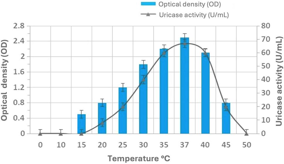 Effect of temperature on the growth (OD) and uricase activity (U/ml) of strain UR1.