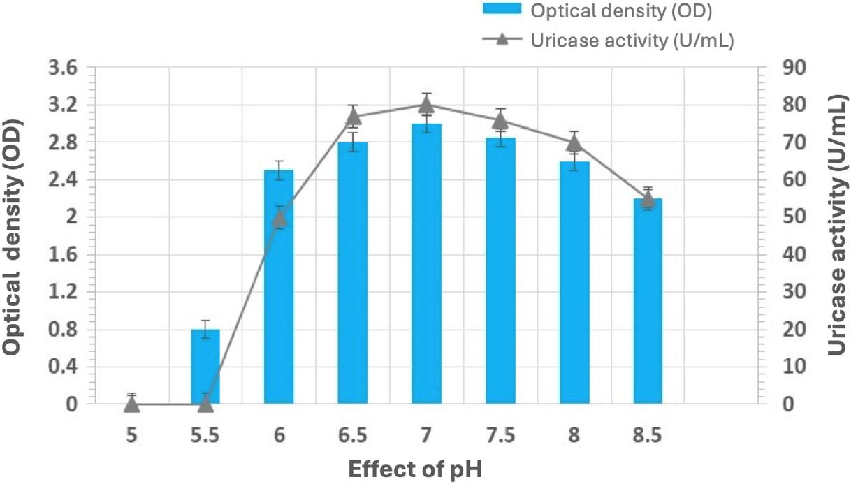 Effect of pH on the growth (OD) and uricase activity (U/ml) of strain UR1.