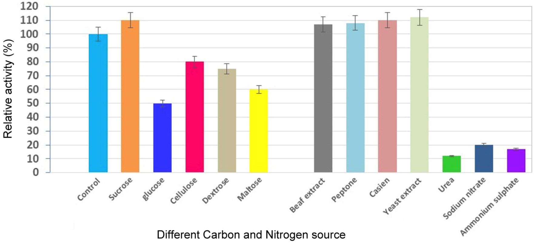 This study aligns with previous investigations, highlighting the uricase enzyme’s industrial and therapeutic roles. Uricase efficacy has been established for the clinical treatments of hyperuricemia and gout. Similarly, Pegloticase and Rasburicase recombinant enzymes have already been approved for clinical applications (Gabison et al. 2008). However, the high cost of production and immunogenicity are major restrictions of these enzymes. Strain UR1-associated extracellular uricase enzyme’s higher stability and activity offer an economical alternative to avoid these hurdles. During this study, sucrose served as the carbon source, considerably improving uricase synthesis and activity. Contrarily, glucose restricted the uricase synthesis, which aligns with previous reports (Watanabe and Morita 1973). Organic nitrogen sources (yeast extract and peptone) also improved enzyme growth and yield whereas inorganic nitrogen sources restricted enzyme synthesis. These findings agree with previous studies and provide valuable information regarding fermentation media optimization during uricase synthesis (Lotfy 2008; Thillainayagi et al. 2021).