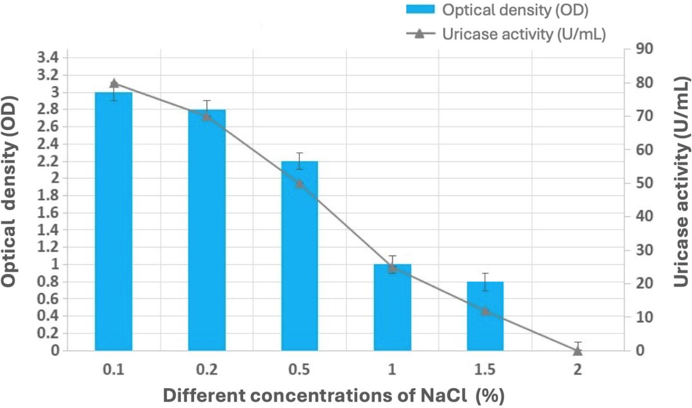 The impact of salt was assessed by adding different NaCl concentrations (0.1, 0.2, 0.5, 1, 1.5, and 2%, w/v) in uric acid-containing BT medium at an initial pH 7. The results indicated a significant reduction in strain UR1 growth and uricase activity with the rise in salt concentration whereas the maximum growth (3 OD) and uricase secretion (80 U/ml) were observed at a NaCl concentration of 0.1% (Fig. 7).