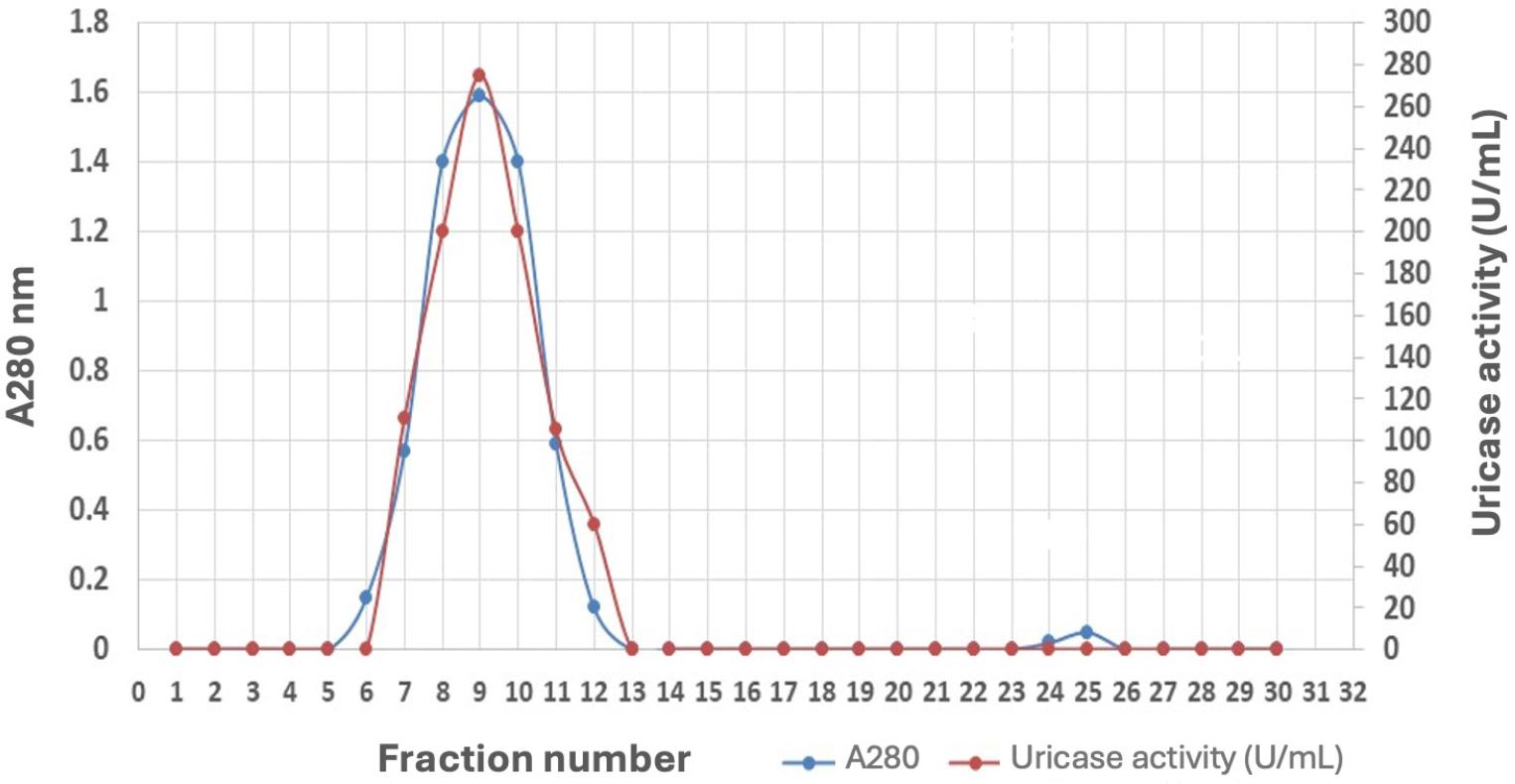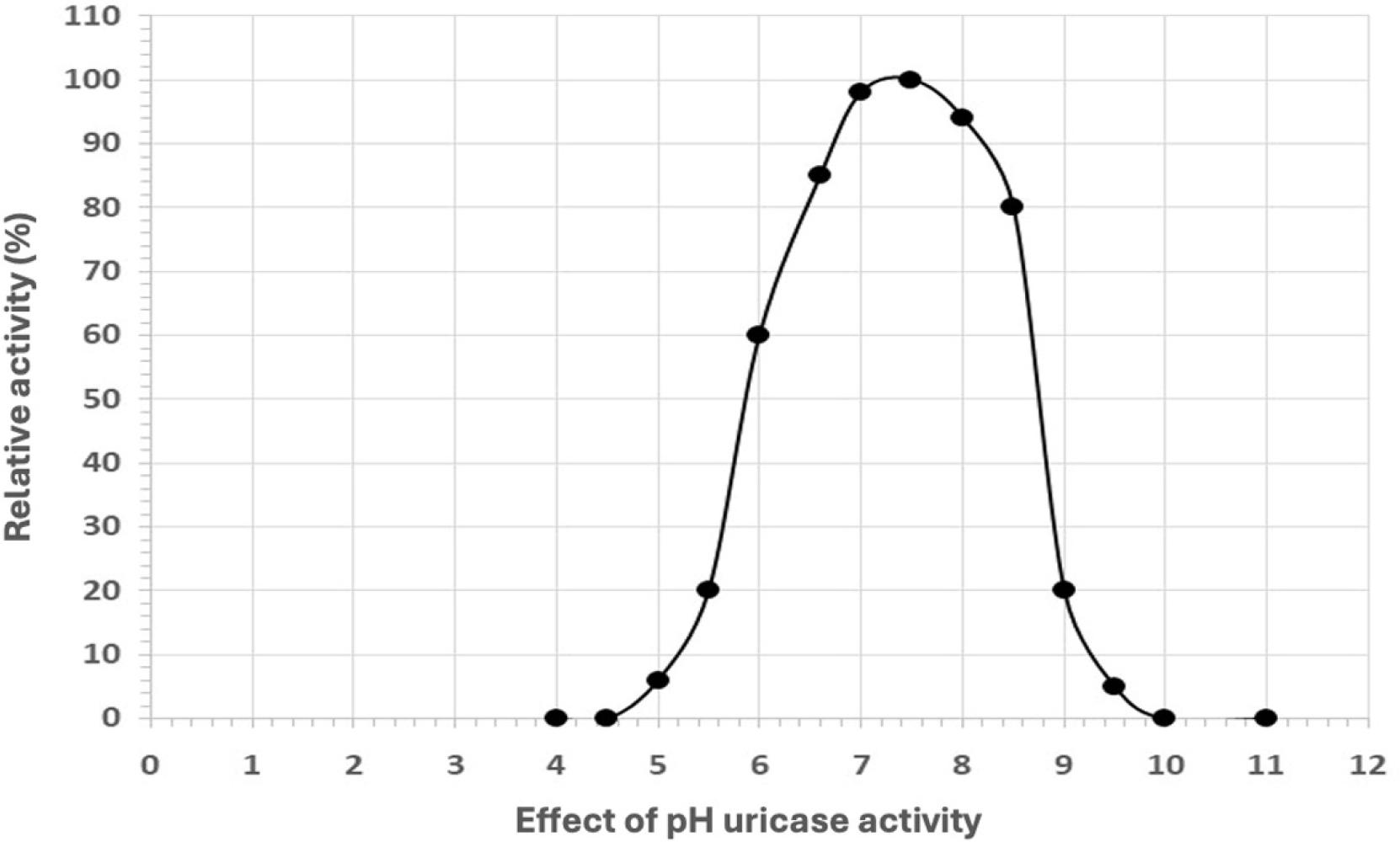 Multiple factors could affect uricase enzyme activity. Previous studies have reported an optimum pH of 8 for uricase activity within a thermal range of 25–45°C. Uricase exposure to 60°C for an hour could reduce its activity by 50% (Chohan and Becker 2009; Ravichandran et al. 2015). Heavy metals are established cofactors for specific enzymes, but their higher concentration could inhibit enzyme activity (Suzuki et al. 2004). Copper inhibited uricase activity, which contradicts the findings of Ravichandran et al. (2015), who reported a copper-based enzyme stimulation by 140%. Similarly, EDTA (1M) based enzyme stimulation has also been reported in various studies (Chohan and Becker 2009; Ravichandran et al. 2015). Nitrogen and carbon sources in the fermentation media are crucial for the uricase-producing microorganisms’ growth and uricase productivity. Uricase production with different carbon sources has been reported whereas peptone is known to facilitate the highest uricase production among various other nitrogen sources (Pfrimer et al. 2010). Most published microbial uricase enzymes are intracellular, requiring cellular disruption to yield uricase. The production of extracellular enzymes is crucial for reducing the time and effort during the purification process (Elbanna et al. 2024).