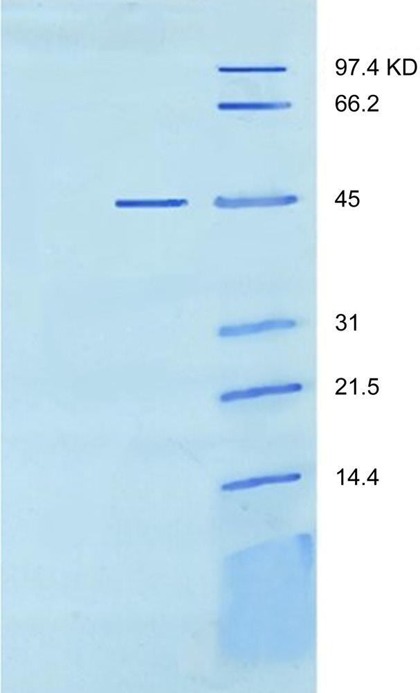 SDS-PAGE revealed the homogeneity of purified uricase. The brilliant blue R-250 staining method was followed to visualize protein bands, which revealed a molecular mass of 45 kDa in a single polypeptide form (Fig. 9).