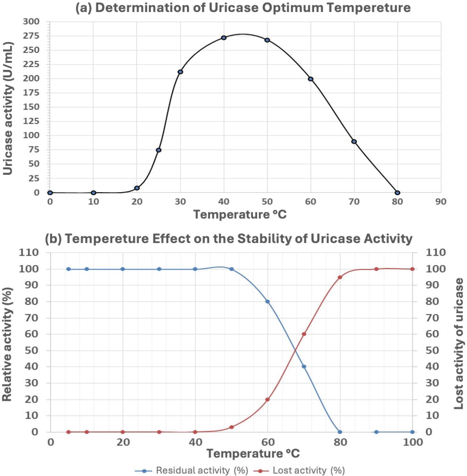 The purified enzyme reaction mixture was incubated at different temperatures (10–70°C) to find the optimum temperature for uricase. Then, the tubes were cooled and uricase activity was spectrophotometrically measured at 293 nm. Uricase stability at different temperatures (4–100°C) was assessed by incubating purified uricase (10 μg) in Tris-HCl buffer (50 mM, pH 7.4) in a thermos-block for 24 h. Uricase residual activity was spectrophotometrically determined at 293 nm.