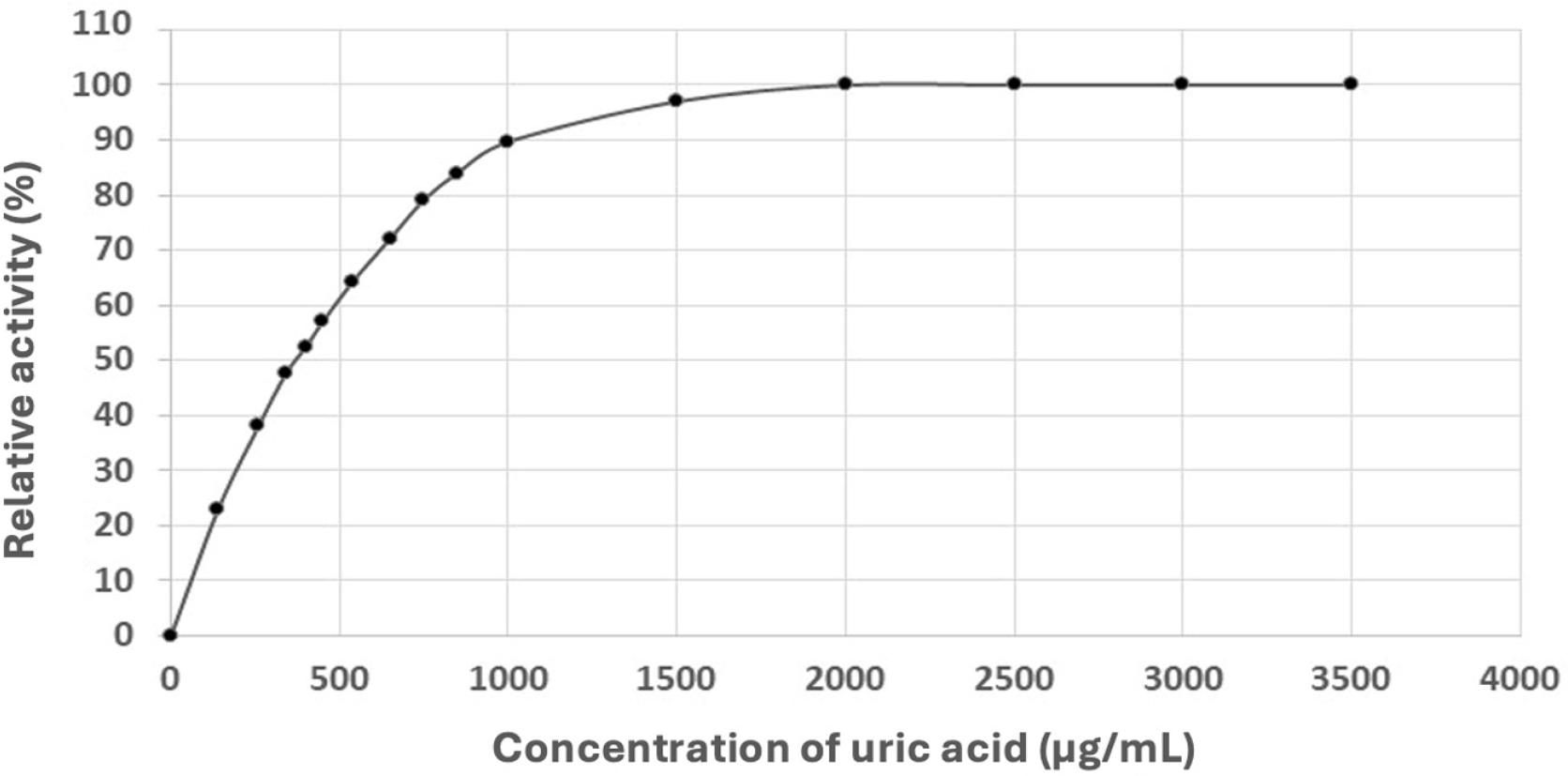 The enzyme activity gradually increased with the rising uric acid concentration, and maximum activity was observed at 2,000 μg. Then, it remained constant, indicating that the enzyme had already been filled/saturated with the substrate and achieved its optimal condition (Fig. 12).