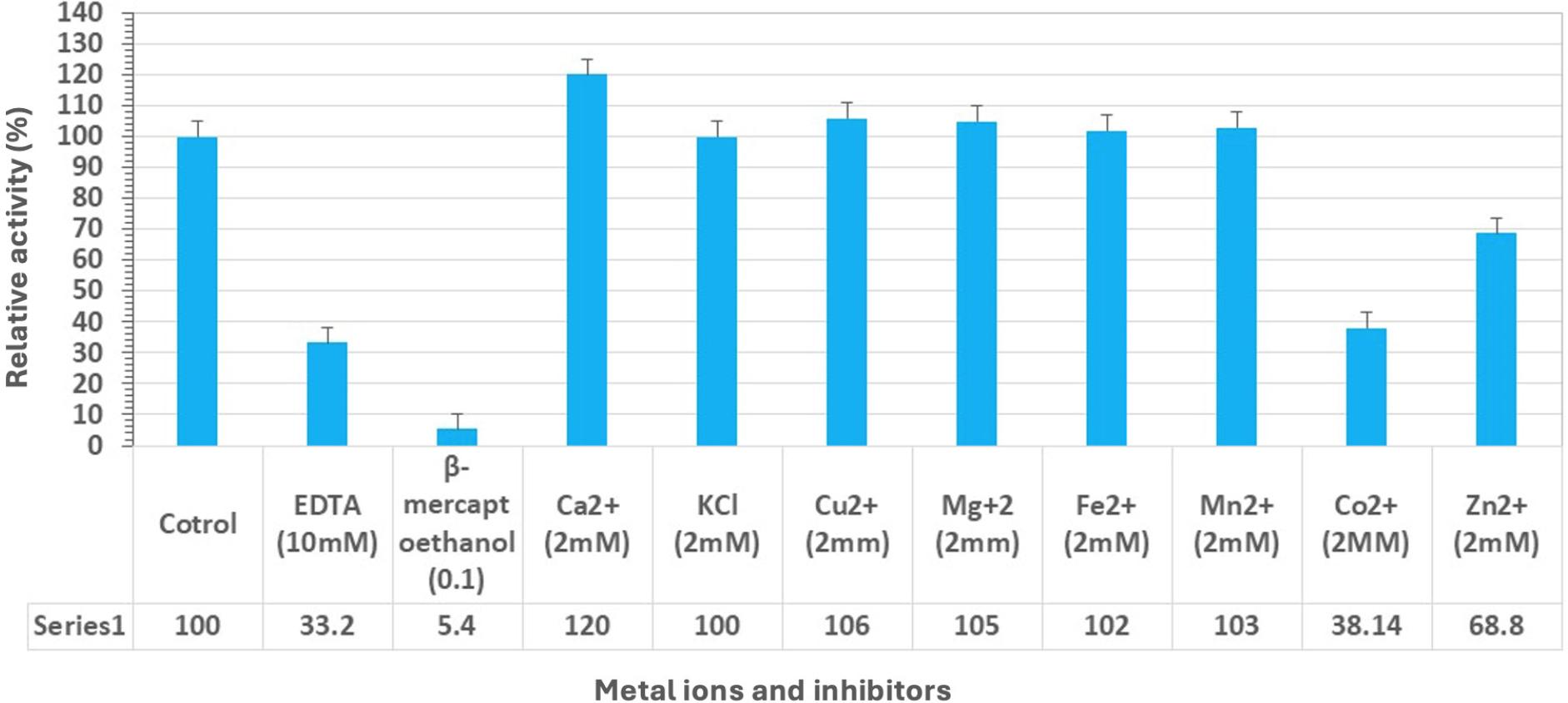 Uricase activity was significantly reduced against various inhibitors such as β-mercaptoethanol (94.6%), EDTA (66.8%), Co2+ (61.81%), and Zn (31.20%). Ca2+ strongly promoted the uricase activity (20%) whereas the increase in uricase activity with other metal ions [Cu2+ (6%), Mg2+ (5%), and Mn2+ (2%)] was comparatively low. It suggests that metal ions could bind to the uricase enzyme to change the enzymatic activity through destabilization or stabilization of the enzyme’s conformation. EDTA-based uricase activity inhibition might be overcome by adding metal ions as cofactors. In this regard, several studies have reported varying effects of cations on enzyme stability and activity (Bakhtiar et al. 2003; Patel et al. 2006; Kai et al. 2008; Atalla et al. 2010; de Oliveira et al. 2010; Ravichandran et al. 2015).