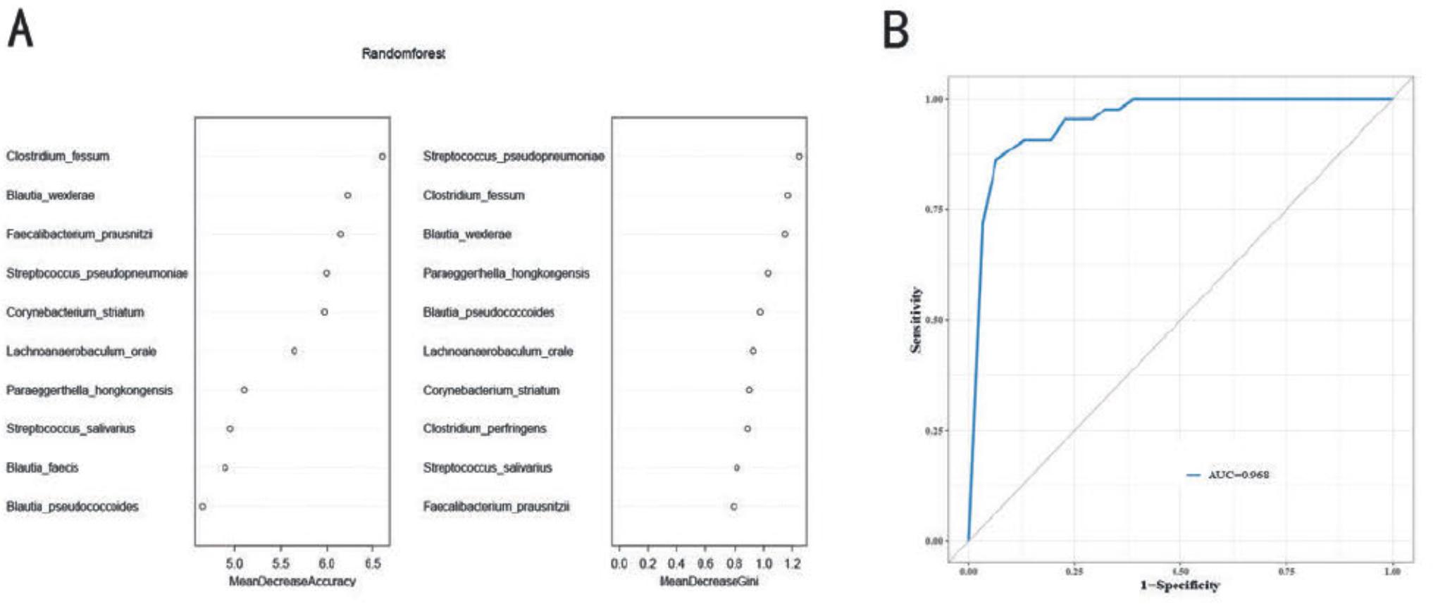 To assess the potential of gut microbiota as a biomarker for diagnosing IPA, we constructed a random forest model using 43 patients in the IPA group and 31 healthy individuals in the H group as the training set (Fig. 5A). Based on the mean decrease in the accuracy value of the random forest, the top five species were selected as markers to distinguish between patients with IPA and healthy individuals. These species included Clostridium fessum, Streptococcus pseudopneumoniae, Corynebacterium striatum, and two butyrate-producing bacteria, B. wexlerae and Faecalibacterium prausnitzii. As assessed via the receiver operating characteristic curve analysis, the model based on these five species achieved an area under the curve of 96.8%, indicating a good diagnostic performance (Fig. 5B).