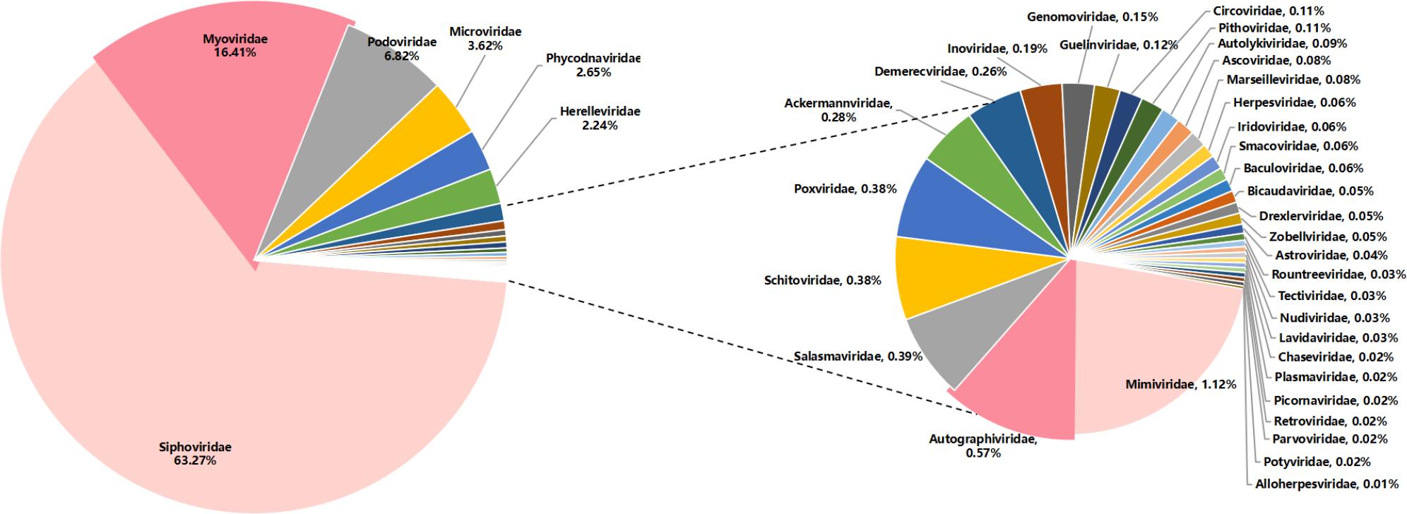 Individual fecal specimens (n=10) underwent standardized processing prior to NovaSeq sequencing and then mixed into a mixture and sequenced. Initially, 100 μl of supernatant was aliquoted from a previously prepared library sample and transferred into a sterile 1.5 ml centrifuge tube. Centrifugation was then performed at 12,000 × g for 5 minutes at 4°C to separate particles, followed by filtration through a 0.45 μm syringe filter to concentrate viral particles (Hoyles et al. 2014; Conceição-Neto et al. 2015). The resultant filtrates were subjected to enzymatic treatment with RNase and DNase to degrade unprotected nucleic acids, with digestion occurring at 37°C for 60 minutes (Zhang et al. 2017). Subsequently, the experimental procedure extracted total nucleic acids using the QiAamp viral RNA minikit. The viral nucleic acid samples were then reverse transcribed using the following enzymes: Super-Script™ IV Reverse Transcriptase (Invitrogen™, Thermo Fisher Scientific Inc., USA) and random hexamer primers. Following reverse transcription, a single cycle of DNA synthesis was conducted using Klenow fragment polymerase (New England BioLabs, USA). Then, libraries were prepared with the Nextera® XT DNA Library Preparation Kit (Illumina, Inc., USA), followed by sequencing on the Illumina®NovaSeq™ 6000 platform with 250 bp paired ends (Liu et al. 2016).