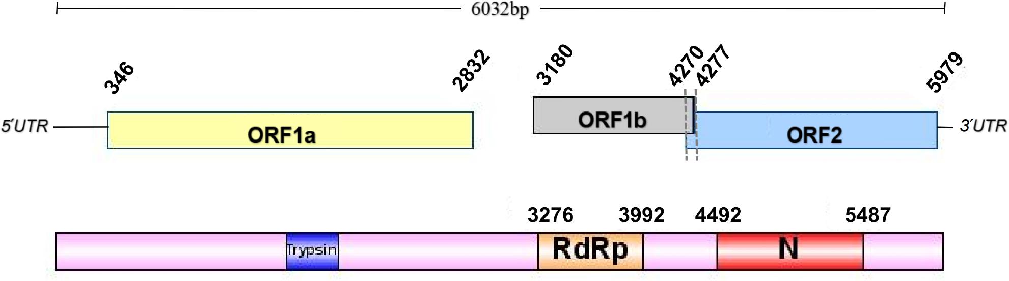 We identified three open reading frames (ORFs) within the nearly complete QTPAstv viral genome, which we designated ORF1a, ORF1b, and ORF2. There is a 7-nucleotide overlap between ORF1b and ORF2 (Fig. 2). Conserved domain analysis, conducted using the NCBI Conserved Domain Search tool, revealed that the conserved RdRp amino acid motif of QTPAstv is situated between positions 3,276 and 3,992 within the genome.