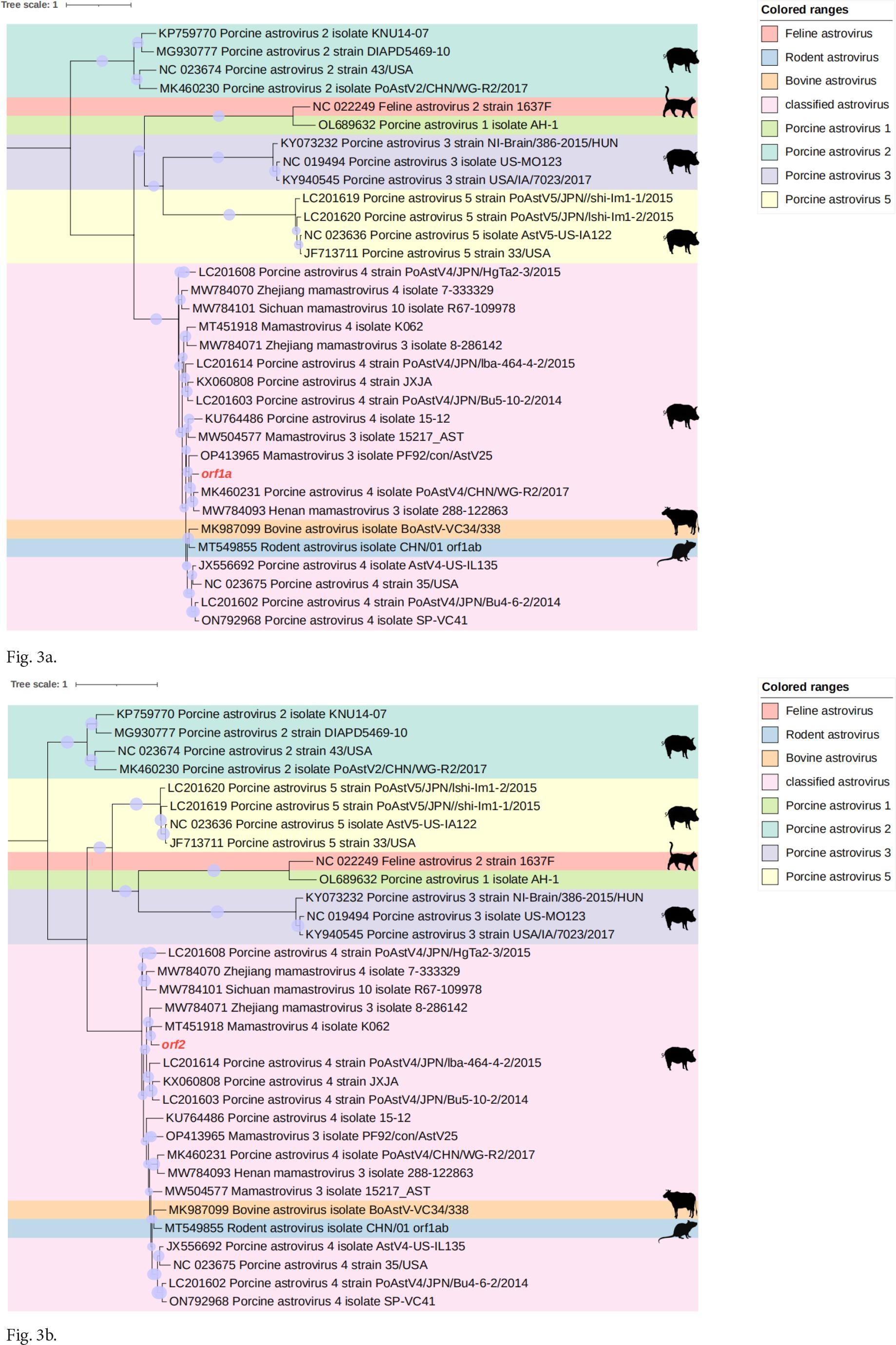 In order to investigate the genetic relationship of QTPAstv, we analyzed the nucleotide sequences of ORF1a and ORF2 obtained from the dataset of this study. These sequences were then compared with reference sequences of mammalian astrovirus genotypes available in the GenBank database. As a result, two phylogenetic trees were constructed. (Fig. 3a and 3b) Sequence analysis using Blastp in NCBI indicated that the ORF1a of QTPAstv shares the highest amino acid sequence identity (93.48%) with the strain ORF1a from Henan mamastrovirus 4 (UMO75810), which was derived from the gut metagenome. In contrast, the ORF2 of QTPAstv shares the highest amino acid sequence identity (84.06%) with the capsid protein strain from Mamastrovirus 3 (XCY59703.1). Different phylogenetic trees were generated for various regions of the same virus, suggesting that QTPAstv may have undergone recombination.