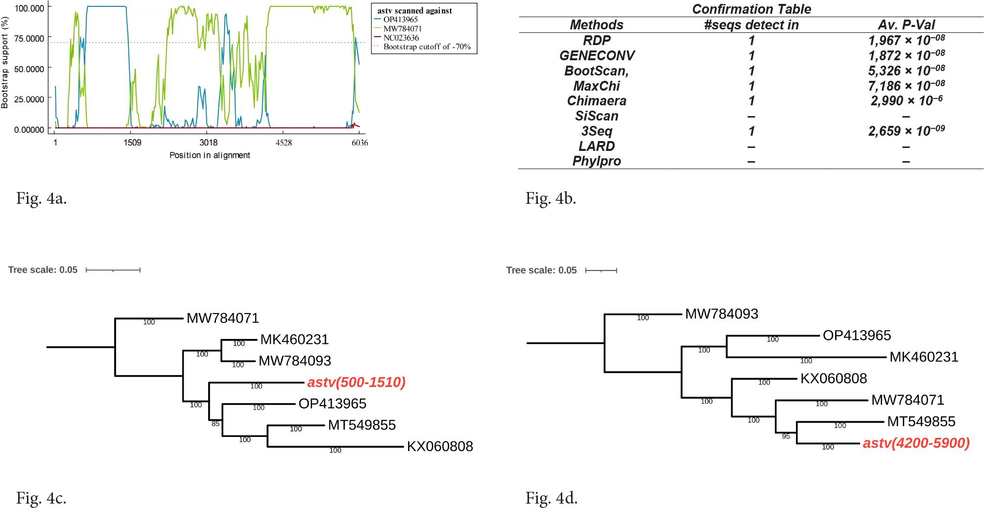 a) Manual BootScan methods on evidence of recombination events occurring with a window size of 200, a step size of 20, and a model of 100 Bootstrap replications. Manual BootScan methods selected QTPAstv as the query, NC023636 as the distantly related sequence, and OP413965 and MW784071 as the parents. b) The confirmation table shows the support obtained by the algorithms for the identified recombination events. c), d) Phylogenetic trees were constructed in the 500–1500 nt and 4200–5900 nt regions respectively.