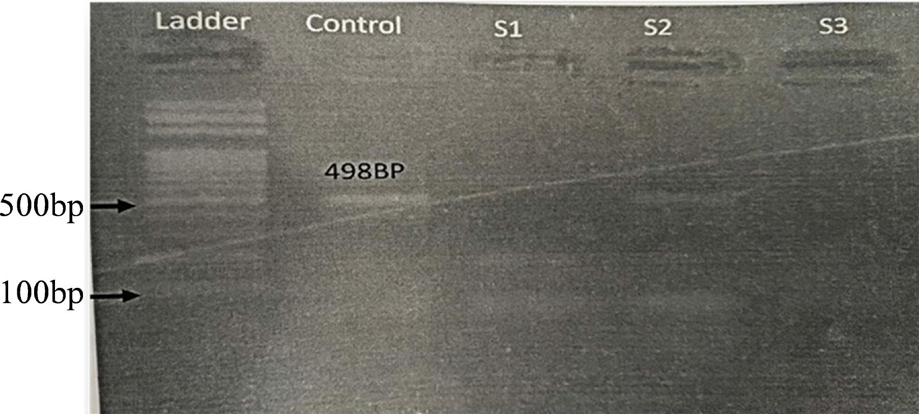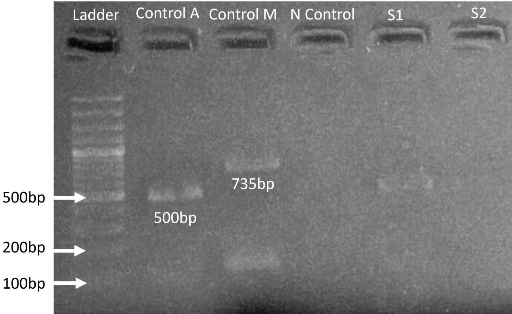 The AMOS polymerase chain reaction results for Brucella abortus. The amplification product of the IS711 gene depicted a band size of 498bp in a sample collected from cattle in district Bannu, Khyber Pakhtunkhwa, Pakistan, M = 100 bp DNA ladder, S2 showing positive samples.