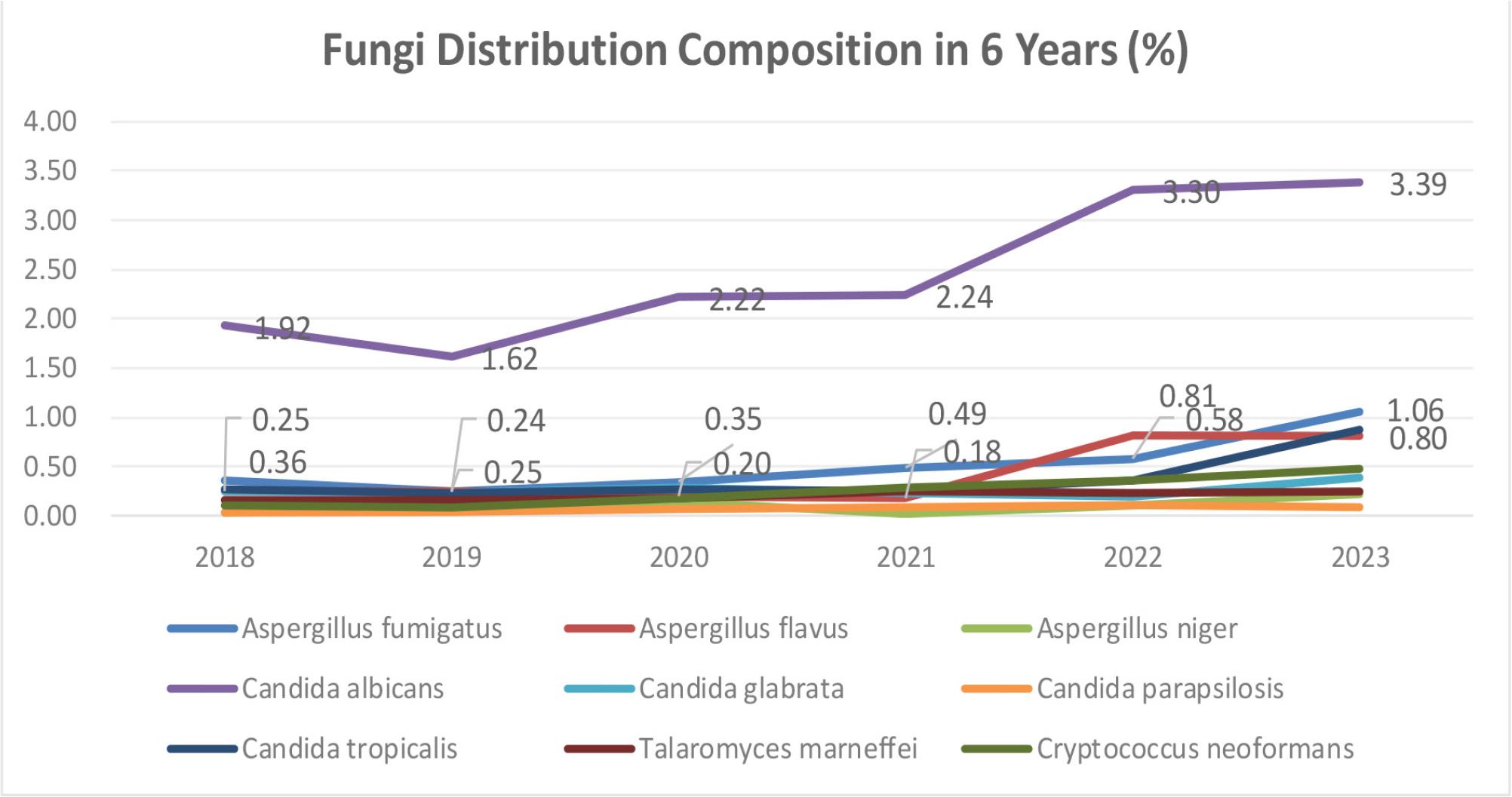As this analysis was based on fungal detection rather than confirmed clinical infections, it is possible that some of the isolates, particularly C. albicans from non-sterile sites, reflect colonization rather than true infection. Nevertheless, their distribution provides important clues for empirical antifungal strategies. We acknowledge that relying solely on fungal culture and MALDI-TOF MS may miss certain cases due to the potential for false-negative results, particularly in patients who had received prior antifungal or broad-spectrum antimicrobial treatment. However, culture-based methods combined with MALDI-TOF remain standard, widely used, and cost-effective techniques for large-scale retrospective analyses in real-world hospital settings, especially where molecular diagnostics are not routinely available. Although this may result in underestimation of the true infection burden, our findings still provide a valuable reflection of the clinical caseload and detection patterns of fungal pathogens across a large and diverse patient population. The upward trend observed is thus likely a conservative estimate and may in fact reflect a more substantial underlying epidemiological burden.