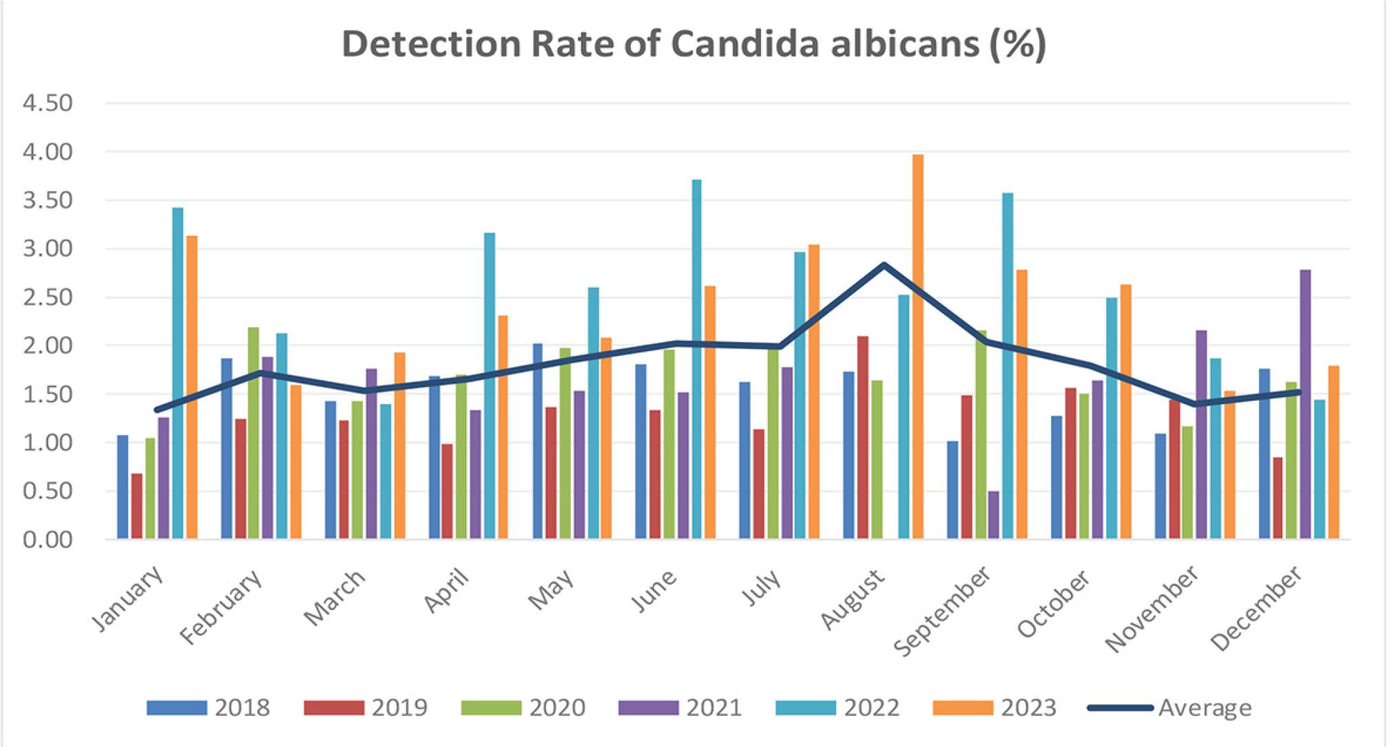 Distribution of Candida albicans among infectious disease patients in different months.