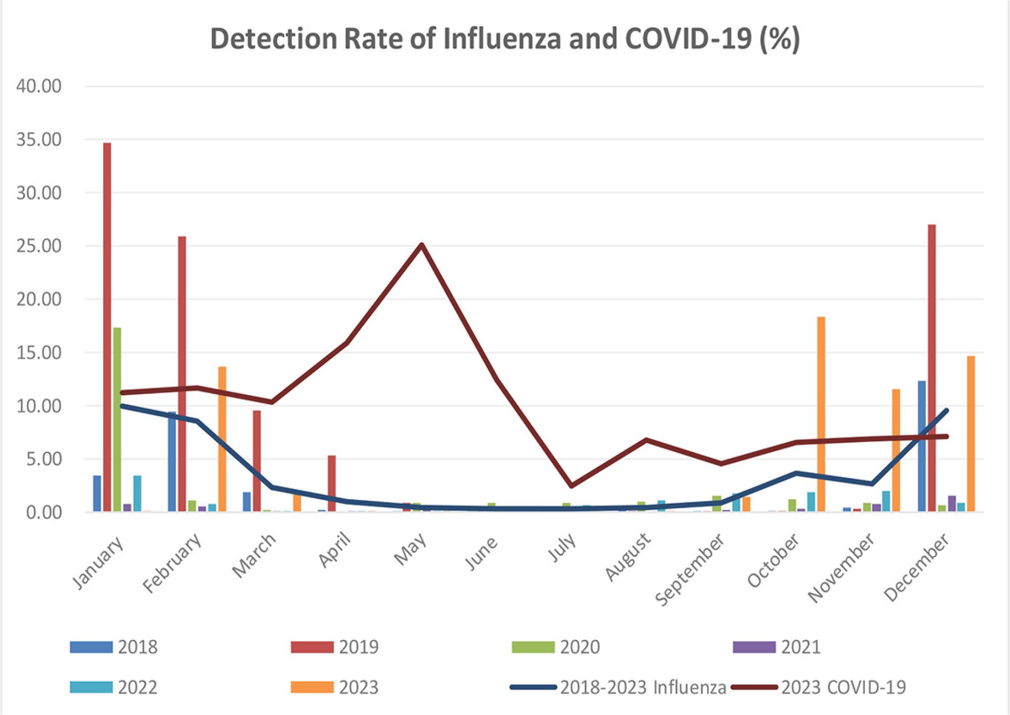 Detection rates of influenza and COVID-19 in throat swab samples (tested by PCR).